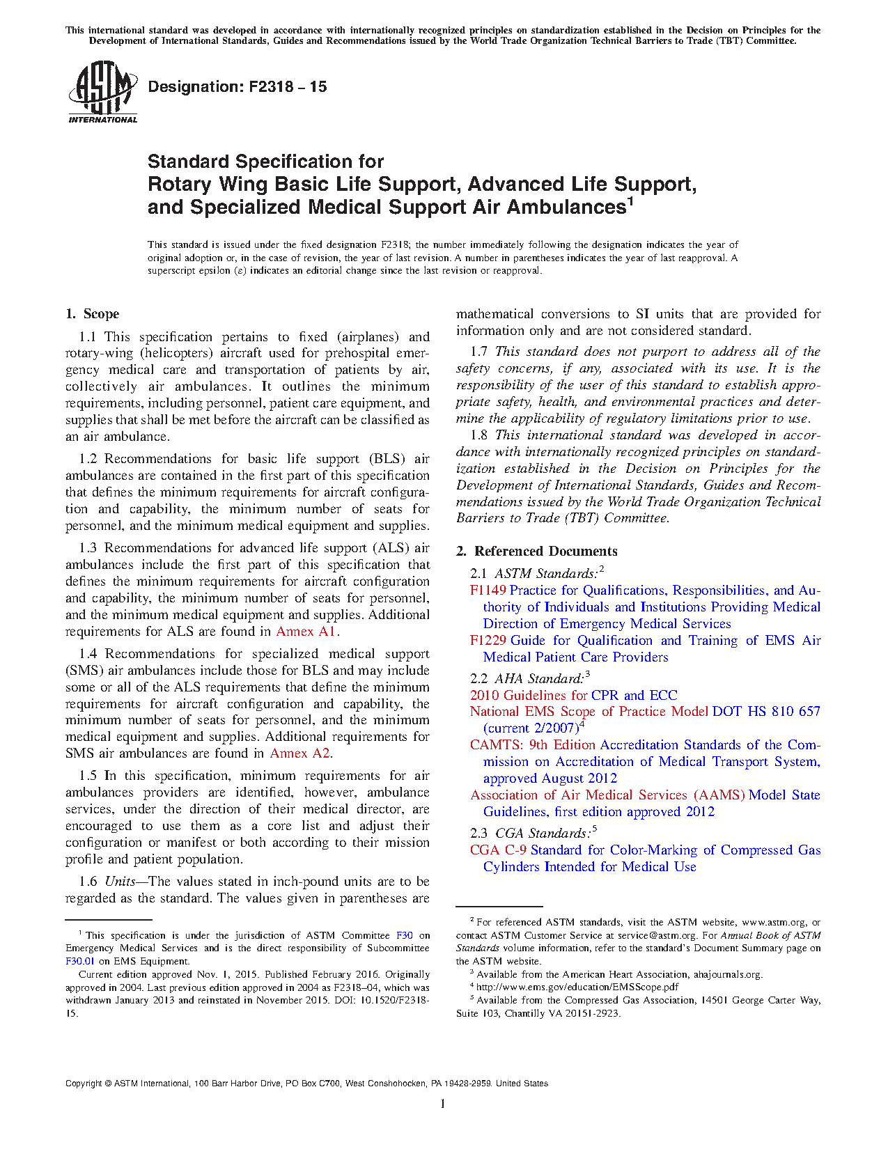 1.1 This specification covers rotary wing aircraft involved in patient prehospital emergency medical care and transportation. It outlines the minimum requirements, including personnel, and patient care equipment and supplies, that must be met before the aircraft can be classified as a rotary wing air ambulance unit.