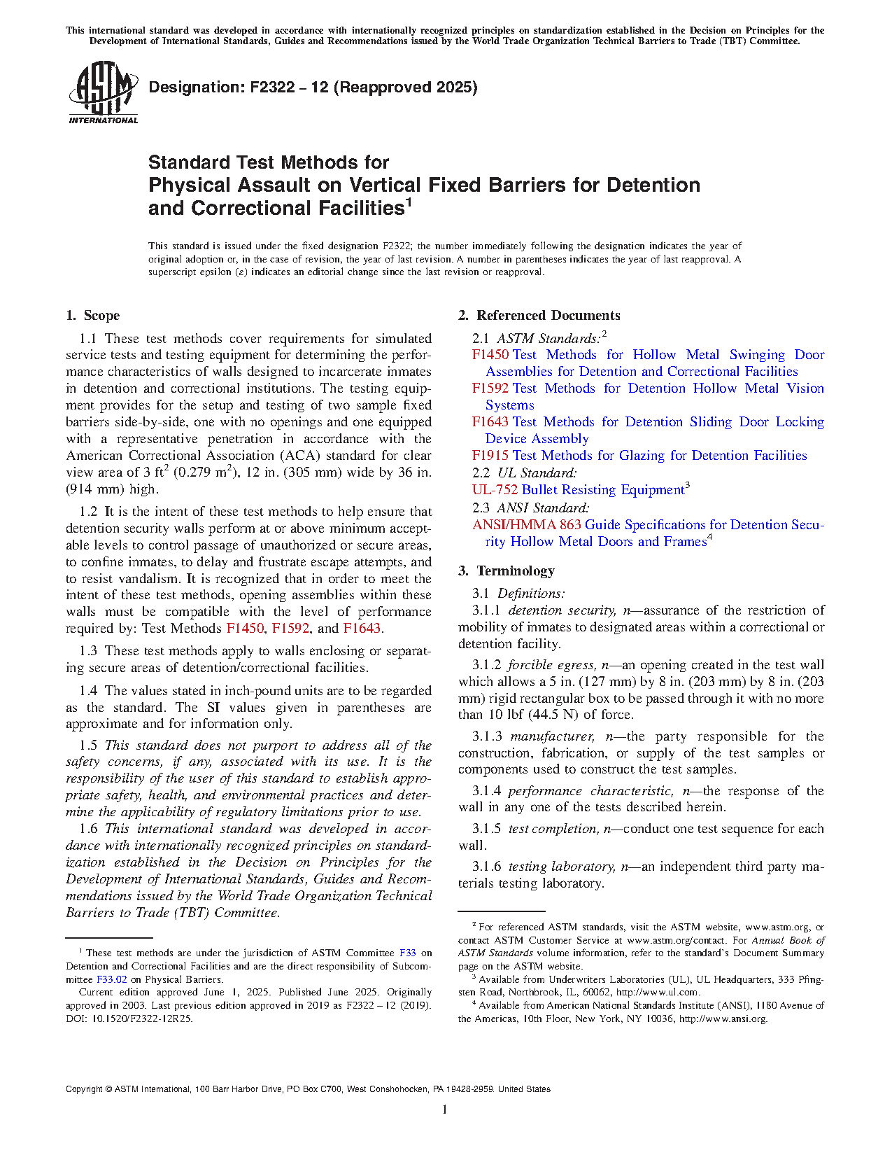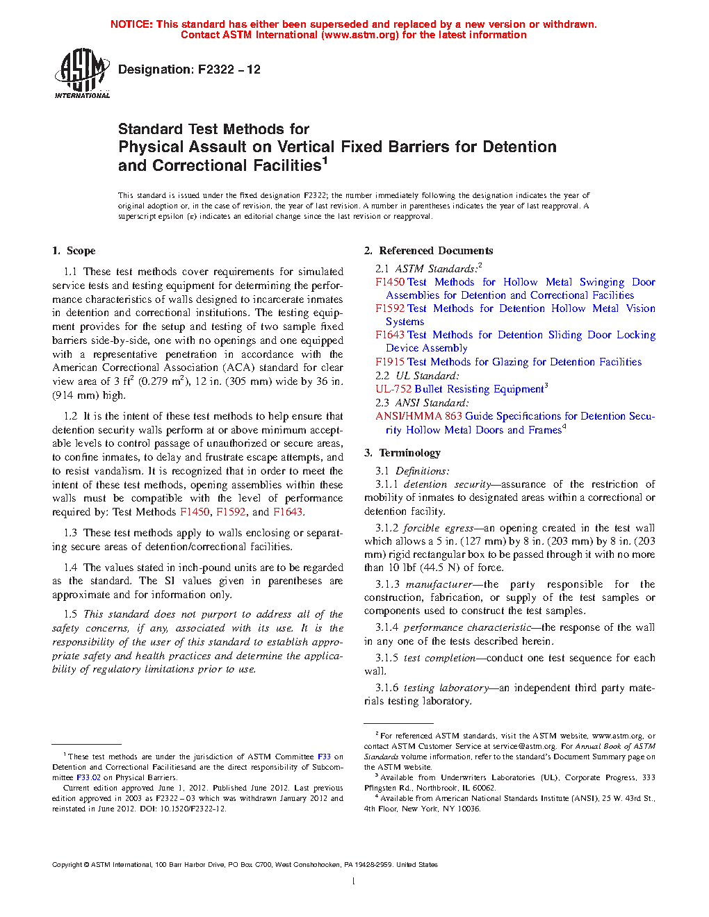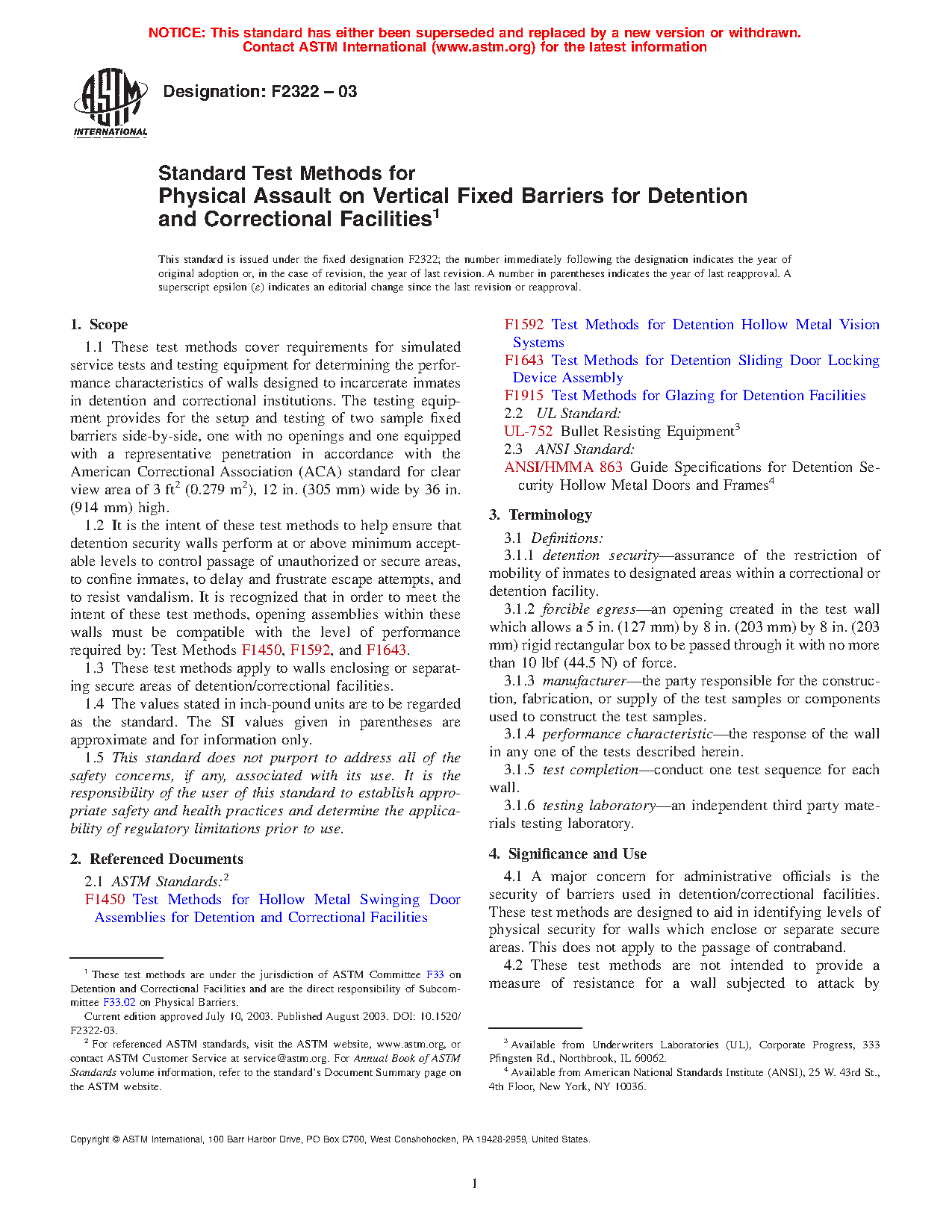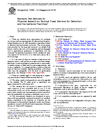 1.2 It is the intent of these test methods to help ensure that detention security walls perform at or above minimum acceptable levels to control passage of unauthorized or secure areas, to confine inmates, to delay and frustrate escape attempts, and to resist vandalism. It is recognized that in order to meet the intent of these test methods, opening assemblies within these walls must be compatible with the level of performance required by: Test Methods F1450, F1592, and F1643.