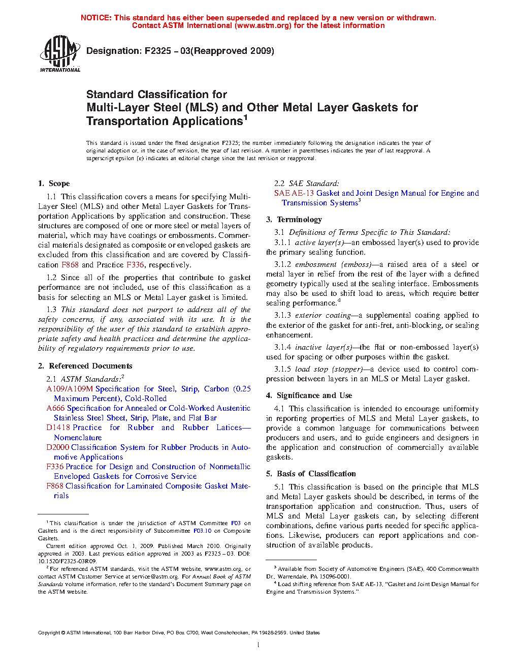 1.2 Since all of the properties that contribute to gasket performance are not included, use of this classification as a basis for selecting an MLS or Metal Layer gasket is limited.