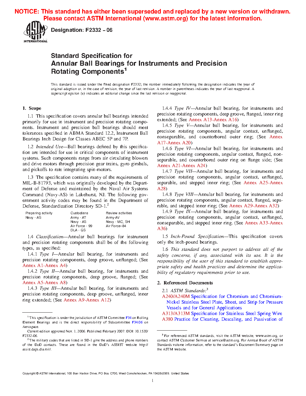 1.4 Classification Annular ball bearings for instrument and precision rotating components shall be of the following types, as specified: