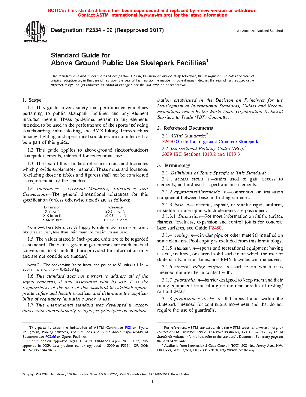 This guide establishes the safety, performance and maintenance requirements pertaining to above-ground (indoor/outdoor), public-use skatepark facilities and any elements included therein that are intended to be used in the performance of the sports including skateboarding, inline skating, and BMX biking. The skatepark elements covered here are guardrails (including return guardrails and adjoining resting deck guardrails), protective edging/surfaces, riding surfaces, copings, approaches/thresholds, stairs, and portable and stand-alone elements. Items such as fencing, lighting, and operational structures are not addressed here.