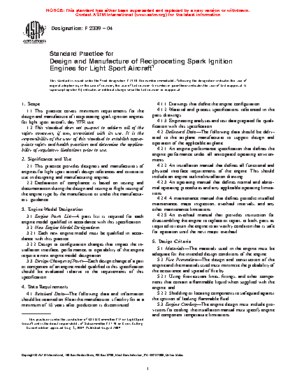 1.1 This practice covers minimum requirements for the design and manufacture of reciprocating spark ignition engines for light sport aircraft, VFR use.