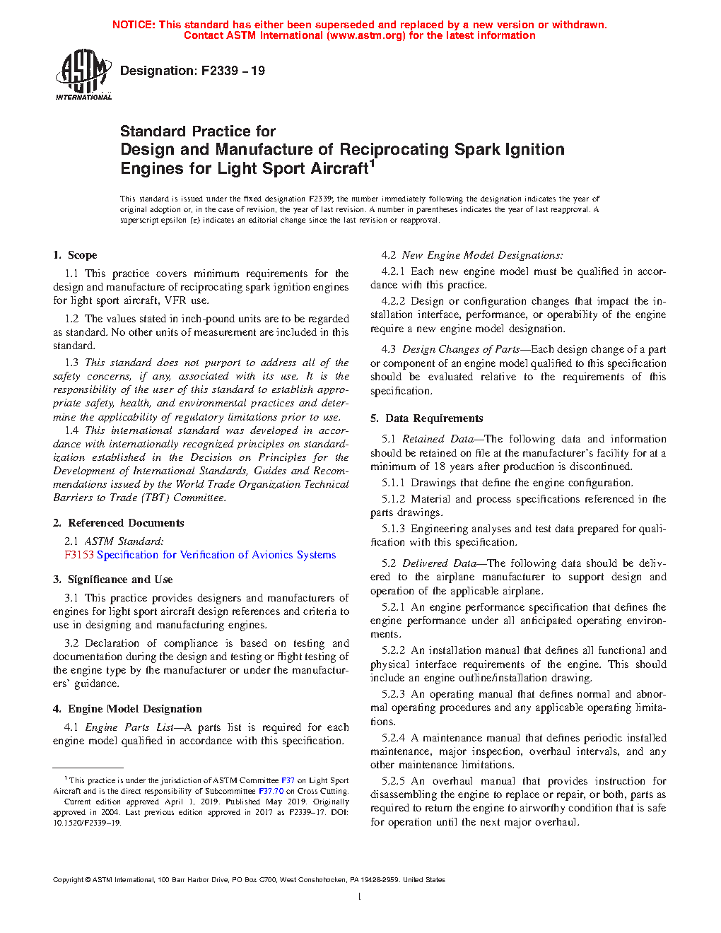 1.1 This practice covers minimum requirements for the design and manufacture of reciprocating spark ignition engines for light sport aircraft, VFR use.