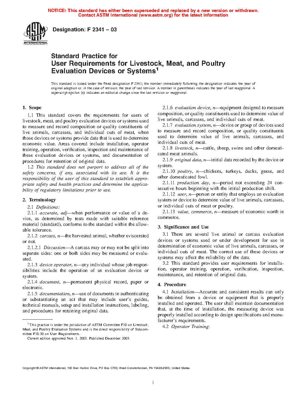 1.1 This practice covers the requirements for users of livestock, meat, and poultry evaluation devices or systems used to measure and record composition or quality constituents of live animals, carcasses, and individual cuts of meat, when those devices or systems provide data that is used to determine economic value. Areas covered include: installation, operator training, operation, verification, inspection and maintenance of these evaluation devices or systems, and documentation of procedures for retention of original data.
