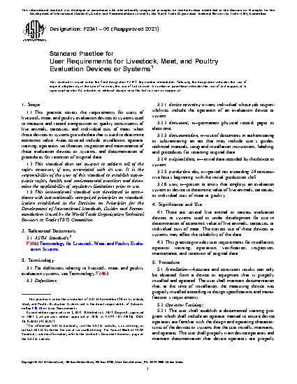 1.1 This practice covers the requirements for users of livestock, meat, and poultry evaluation devices or systems used to measure and record composition or quality constituents of live animals, carcasses, and individual cuts of meat, when those devices or systems provide data that is used to determine economic value. Areas covered include: installation, operator training, operation, verification, inspection and maintenance of these evaluation devices or systems, and documentation of procedures for retention of original data.