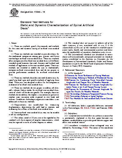 These test methods are designed to quantify the static and dynamic characteristics of different designs of artificial intervertebral discs. These tests are conducted in vitro in order to allow for analysis of individual disc replacement devices and comparison of the mechanical performance of multiple artificial intervertebral disc designs in a standard model.
