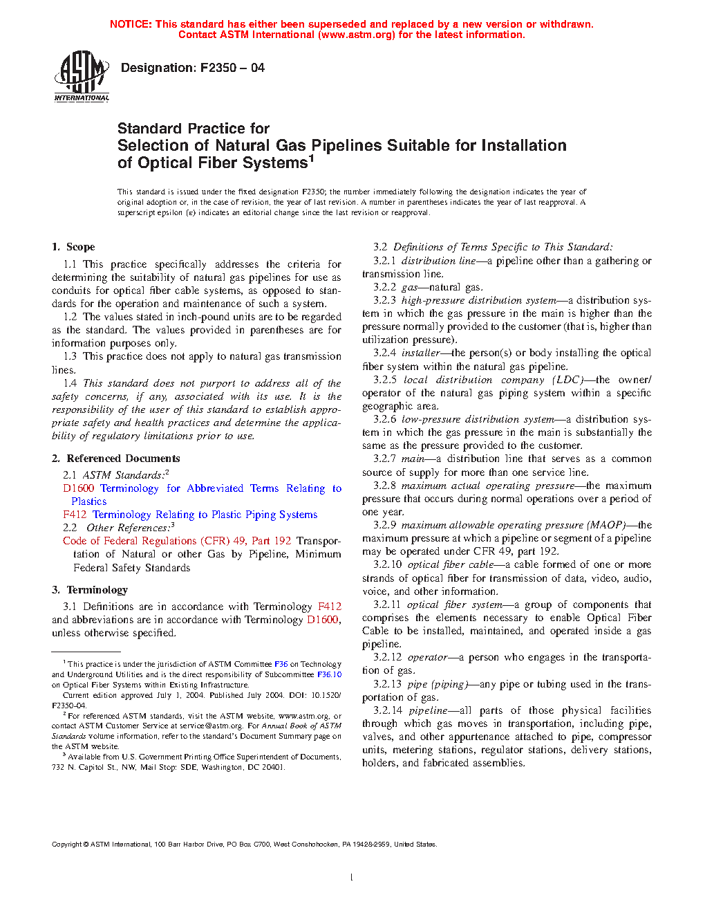 This practice is intended to assist engineers, LDC's and installers in determining the suitability of gas pipelines for a secondary use as carriers for optical fiber systems. It must be kept in mind that the primary use of the gas pipelines is to deliver natural gas to the end customer. Any secondary use of the system shall have minimal impact on its primary function. It is up to the engineer to decide upon the order of operations and any exceptions that may be involved in the selection process.