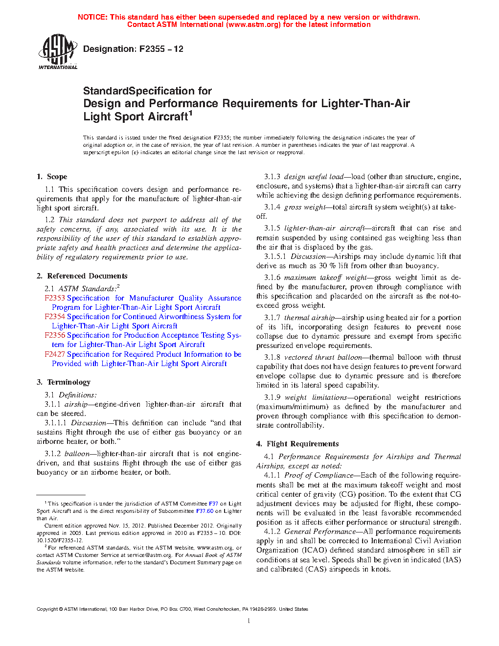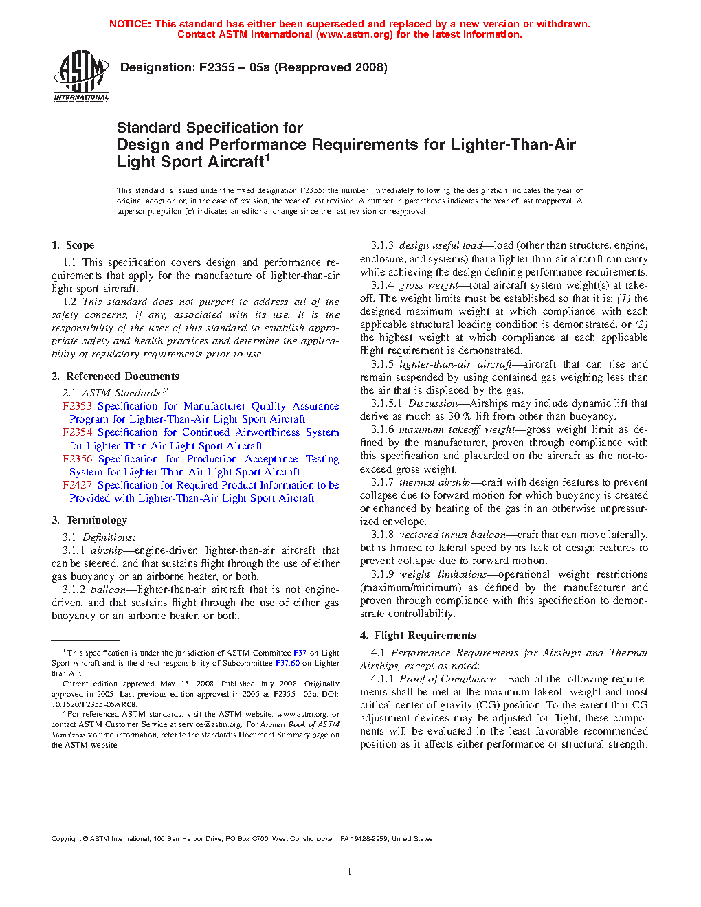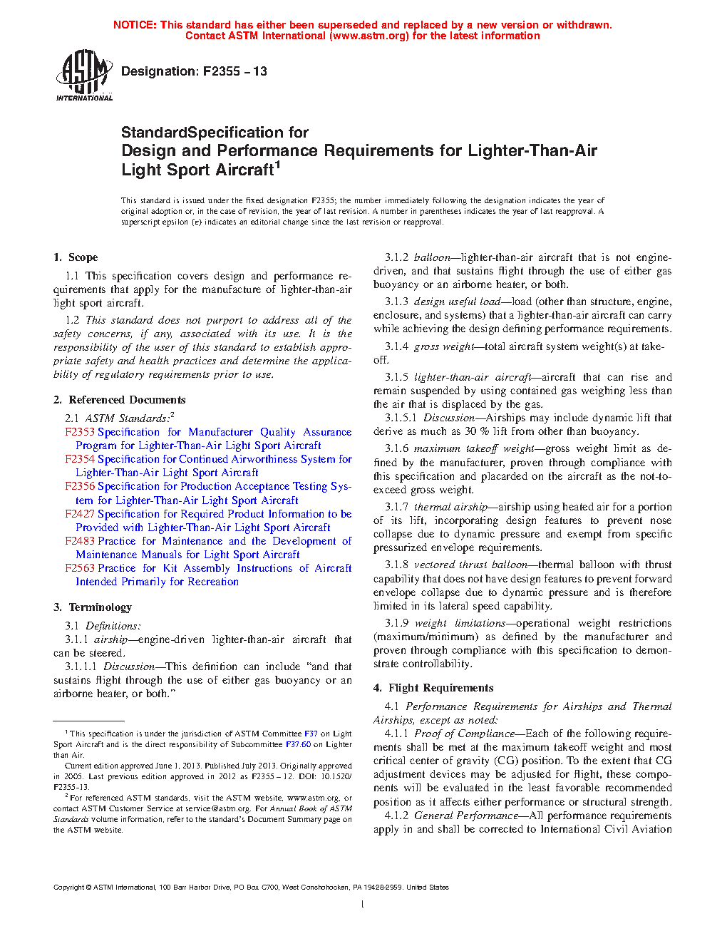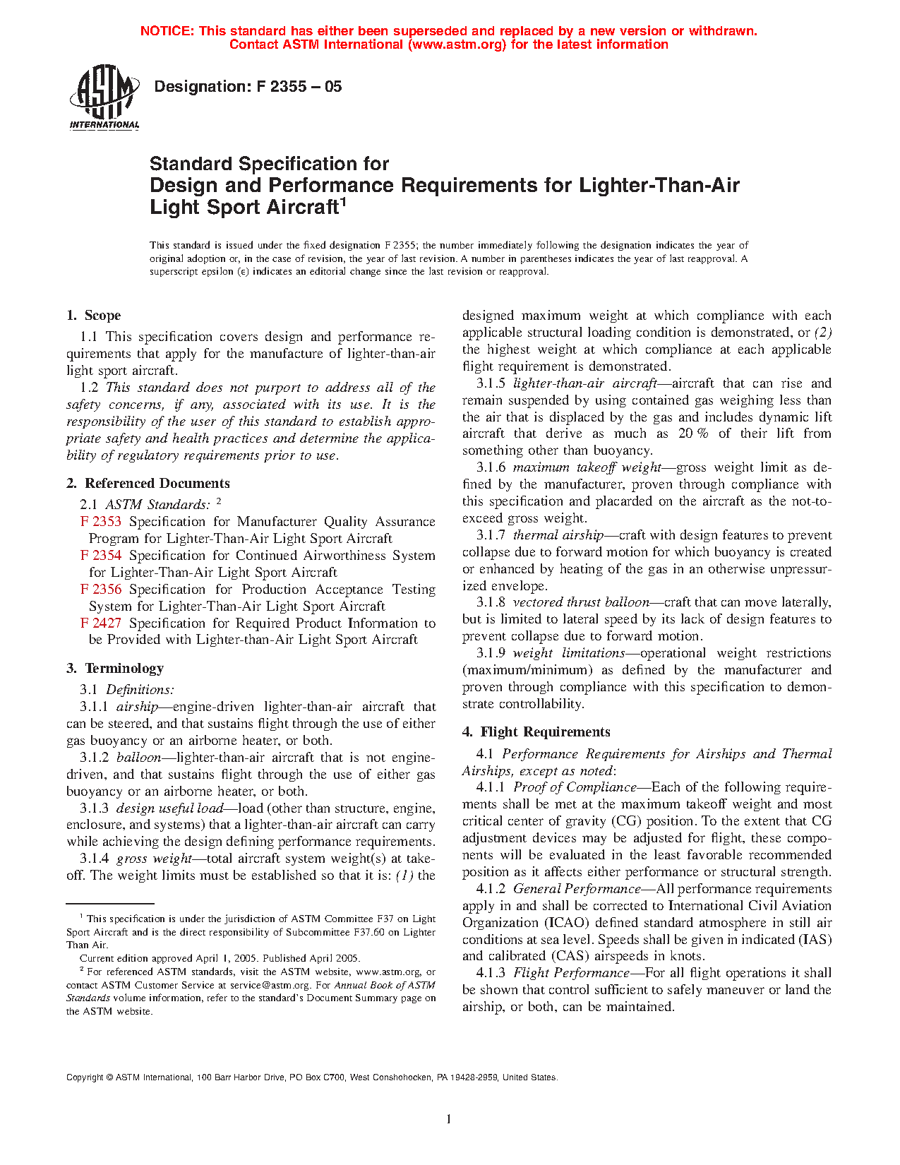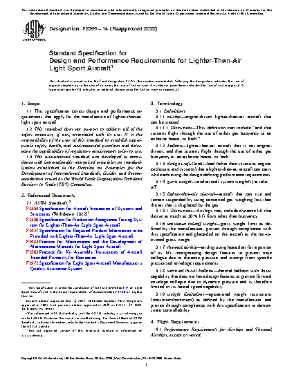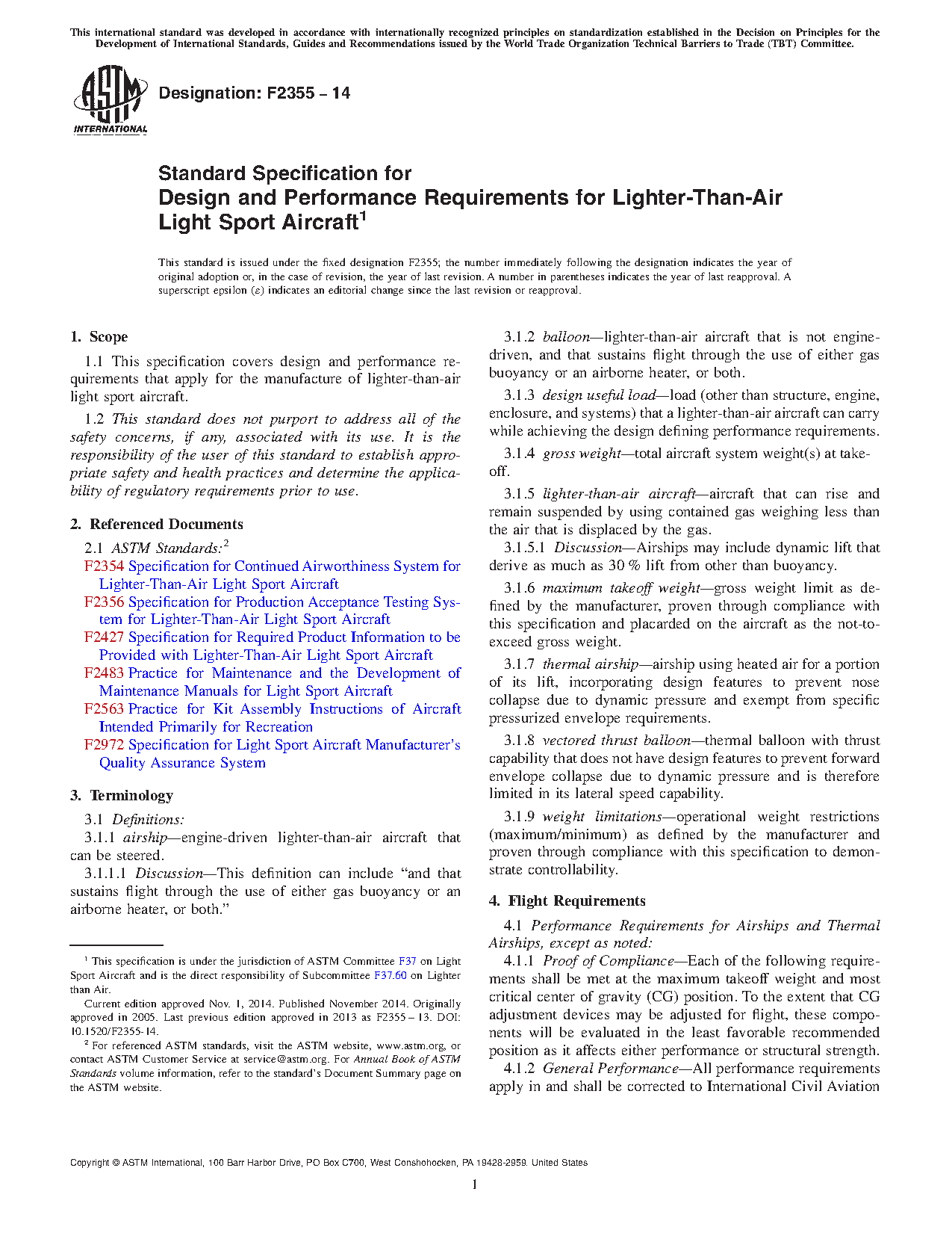 1.1 This specification covers design and performance requirements that apply for the manufacture of lighter-than-air light sport aircraft.
