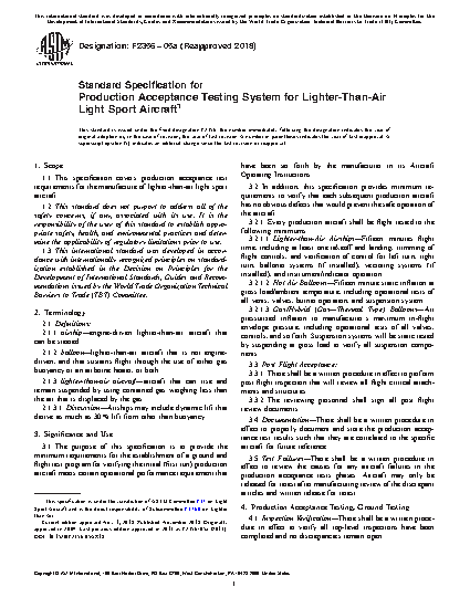 This specification covers production acceptance test requirements for the manufacture of lighter-than-air light sport aircraft. This provides the minimum requirements for the establishment of a ground and flight test program for verifying the initial (first run) production aircraft meets certain operational performance requirement that have been set forth by the manufacturer in its Aircraft Operating Instructions. The minimum requirements to verify that each subsequent production aircraft has no obvious defects that would prevent the safe operation of the aircraft are described. Every production aircraft shall be flight tested to the minimums such as lighter-than-air airships, hot-air balloons and gas/hybrid balloons.