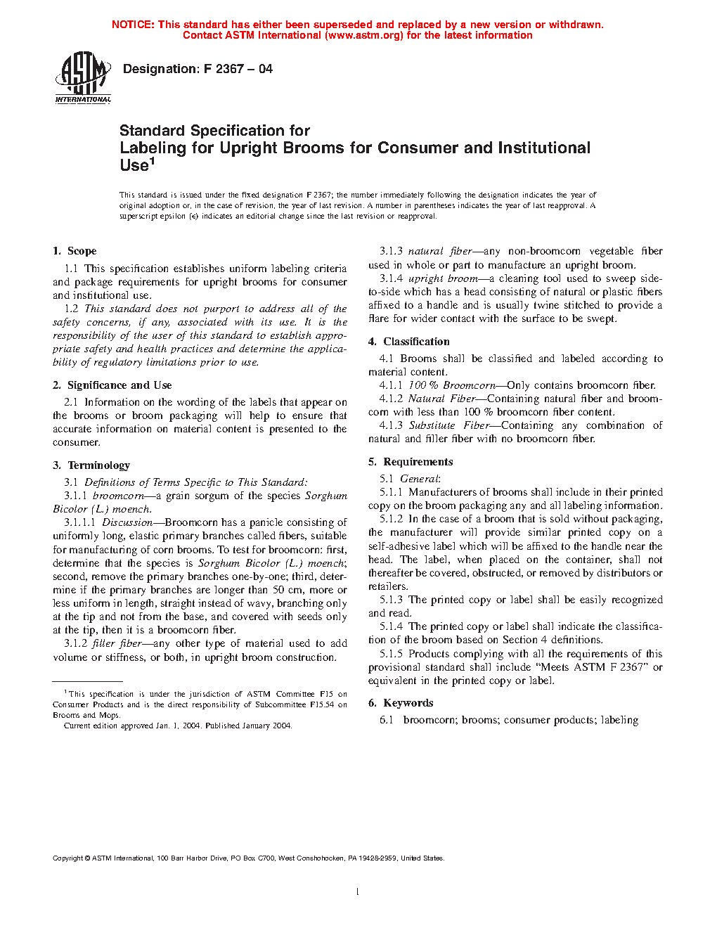 1.1 This specification covers uniform labeling criteria and package requirements for upright brooms for consumer and institutional use.