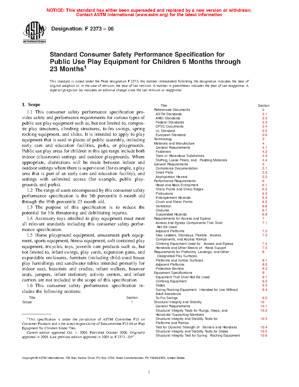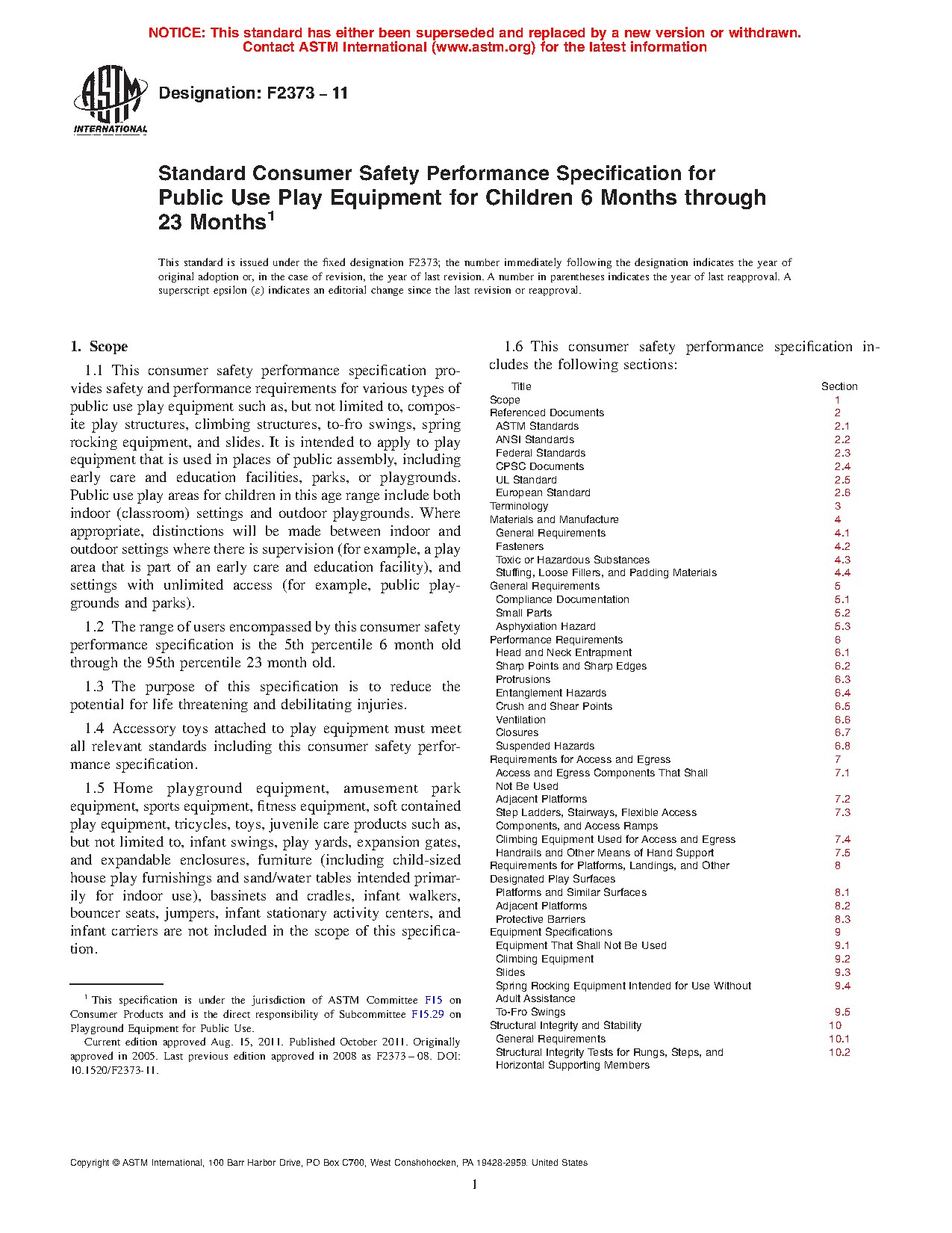 1.6 This consumer safety performance specification includes the following sections: