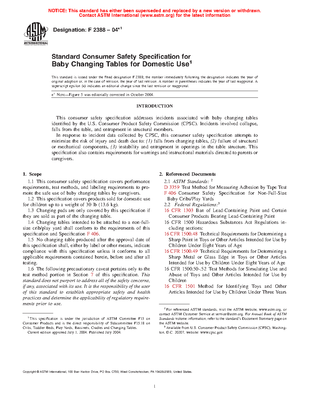 1.1 This consumer safety specification covers performance requirements, test methods, and labeling requirements to promote the safe use of baby changing products including changing tables, changing table accessories, contoured changing pads, and add-on changing units.