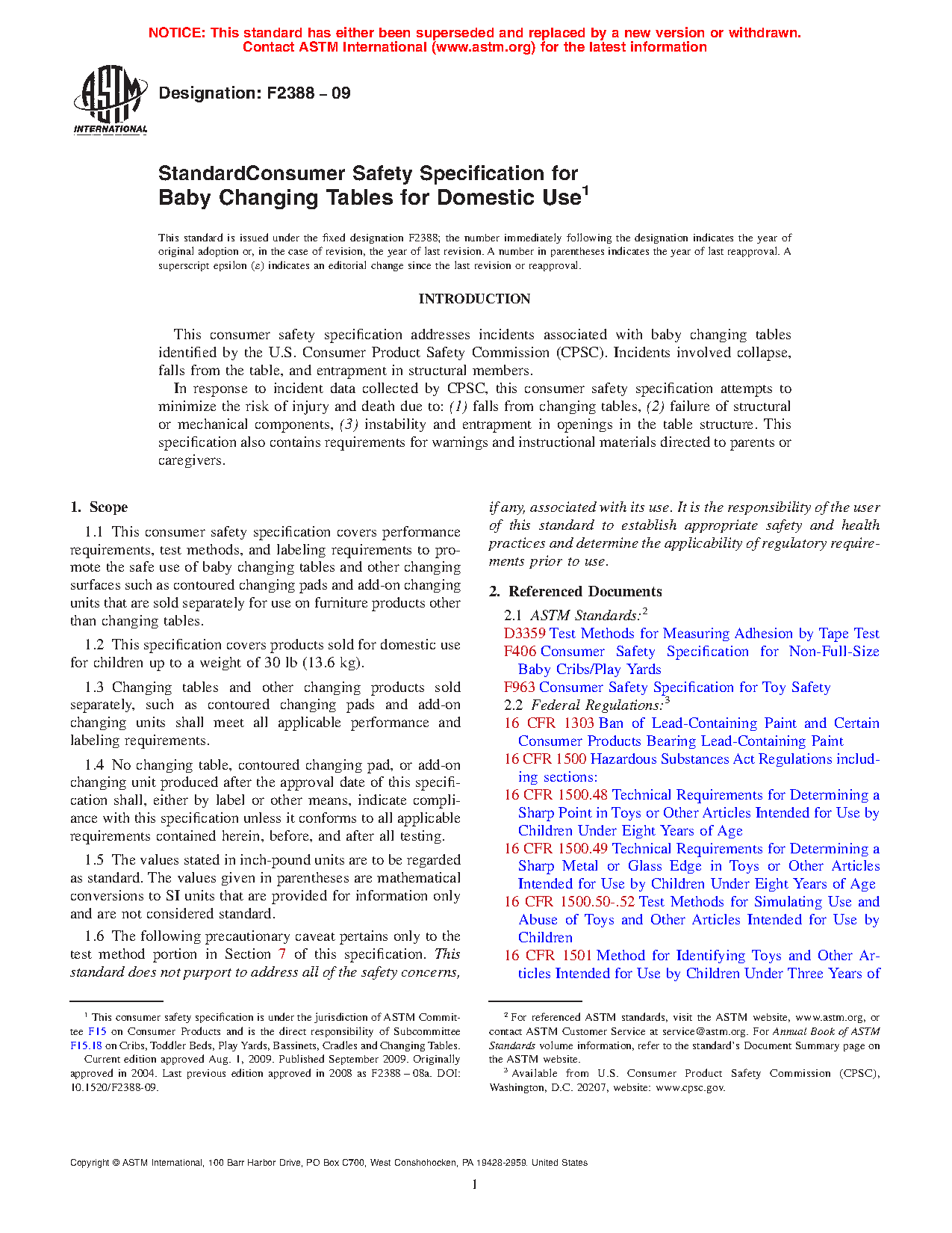 1.1 This consumer safety specification covers performance requirements, test methods, and labeling requirements to promote the safe use of baby changing products including changing tables, changing table accessories, contoured changing pads, and add-on changing units.