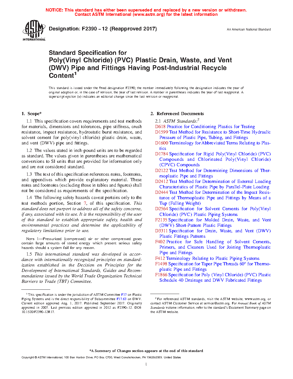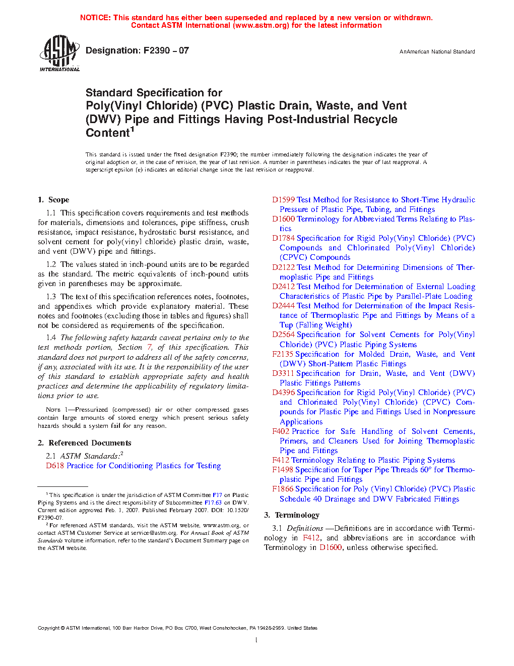 This specification covers the basic requirements and corresponding test methods for poly(vinyl chloride) (PVC) plastic drain, waste, and vent (DWV) pipes and fittings that contain a uniform blend of virgin PVC compound and post-industrial recycle material. When evaluated by the test procedures provided herein, the pipes and fittings shall conform to specified values of the following requirements: dimensions; pipe stiffness, deflection load, lower confidence limit, and flattening resistance; crush resistance; impact resistance; hydrostatic burst resistance; and solvent cement.