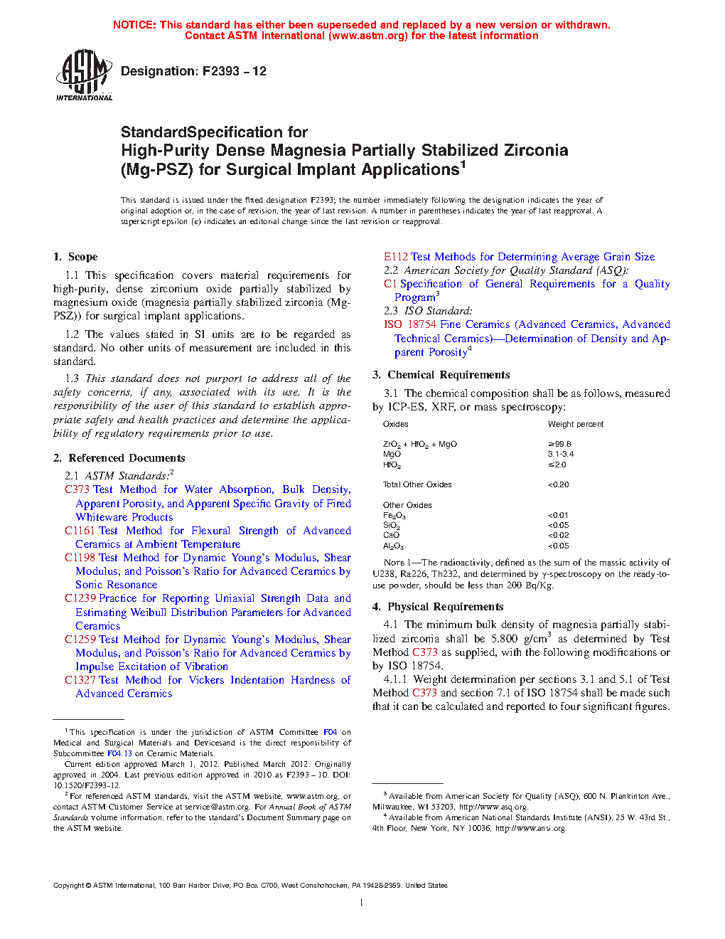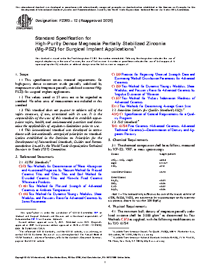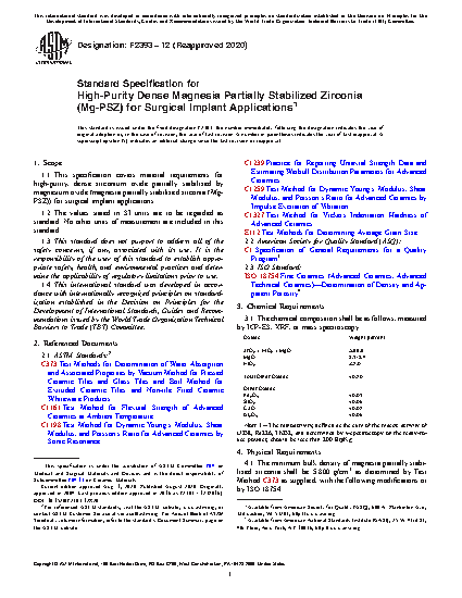 1.1 This specification covers material requirements for high-purity dense zirconium oxide partially stabilized by magnesium oxide (magnesia partially stabilized zirconia (Mg-PSZ)) for surgical implant applications.