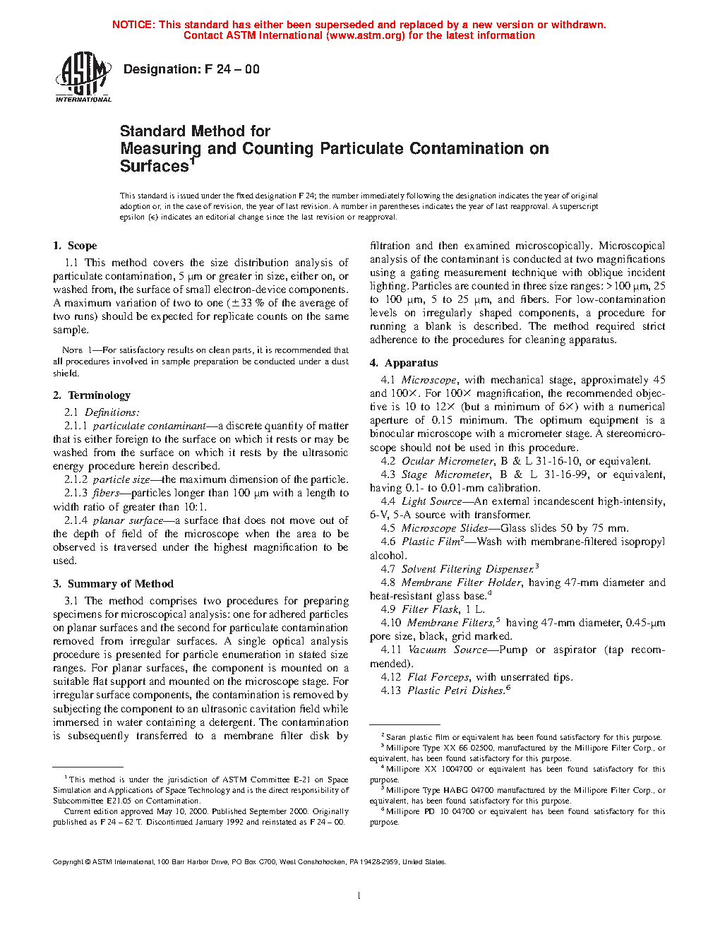 This test method establishes the standard procedures for measuring and quantizing the size distribution of particulate contamination either on, or washed from, the surface of small electron-device components. The apparatus and reagents required for this test are also enumerated herein. The number of required test specimens is governed by the dimensions of the component or surface being analyzed. Results shall be interpreted as particles per component or particles per square centimetre of component surface.