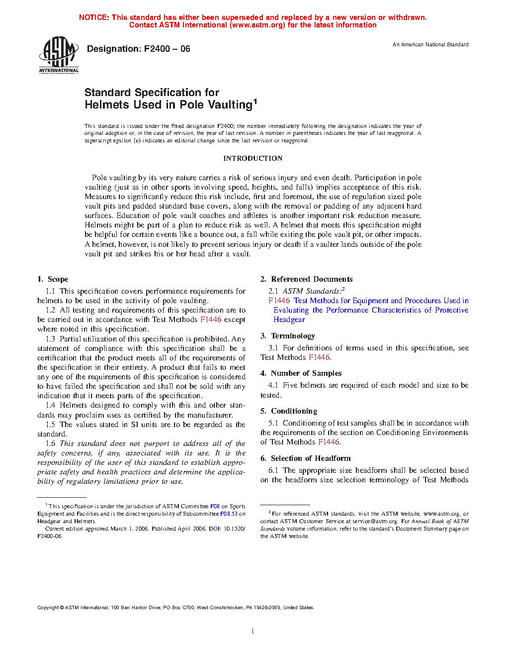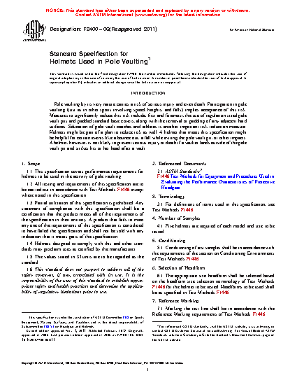 1.1 This specification covers performance requirements for helmets to be used in the activity of pole vaulting.