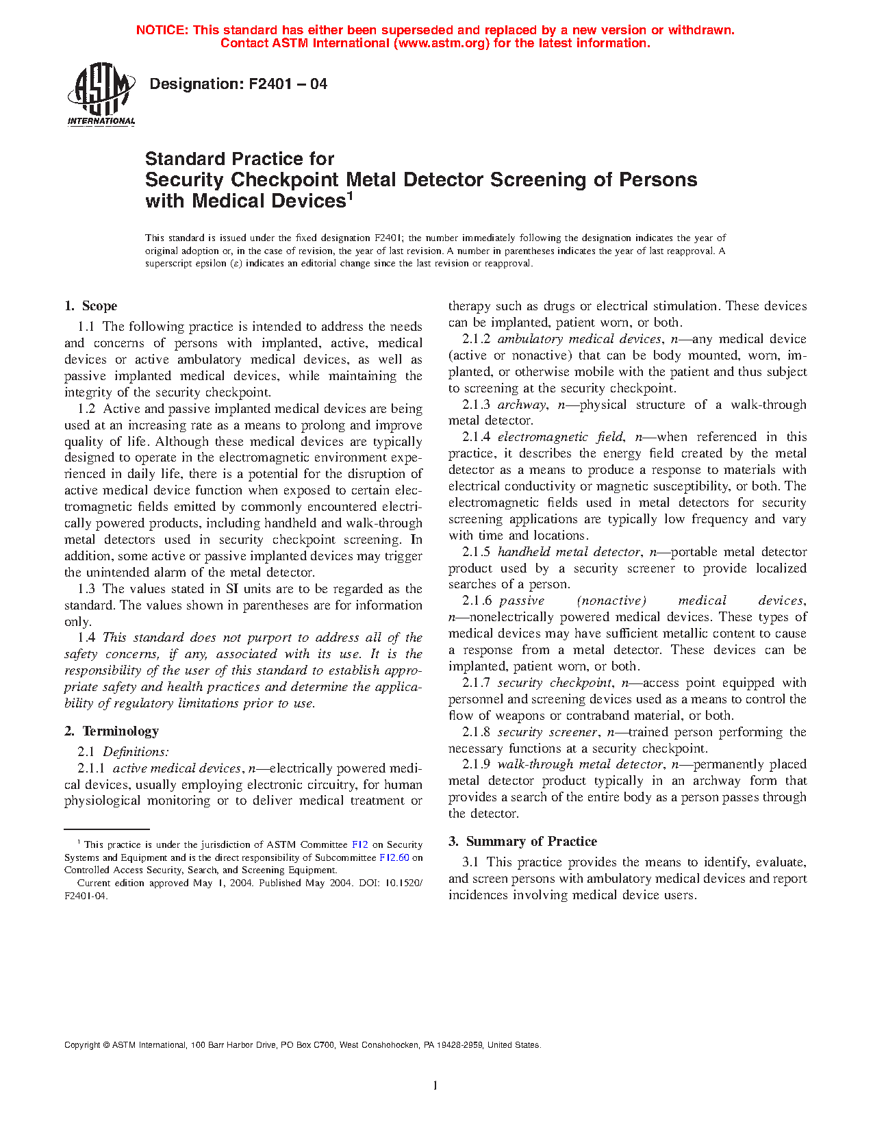 1.1 The following practice is intended to address the needs and concerns of persons with implanted, active, medical devices or active ambulatory medical devices, as well as passive implanted medical devices, while maintaining the integrity of the security checkpoint.