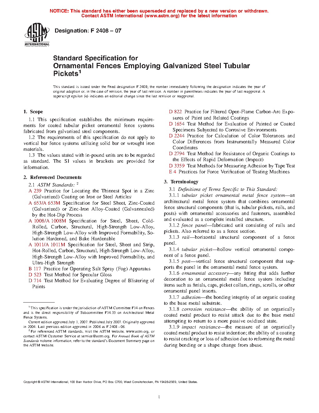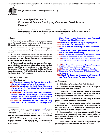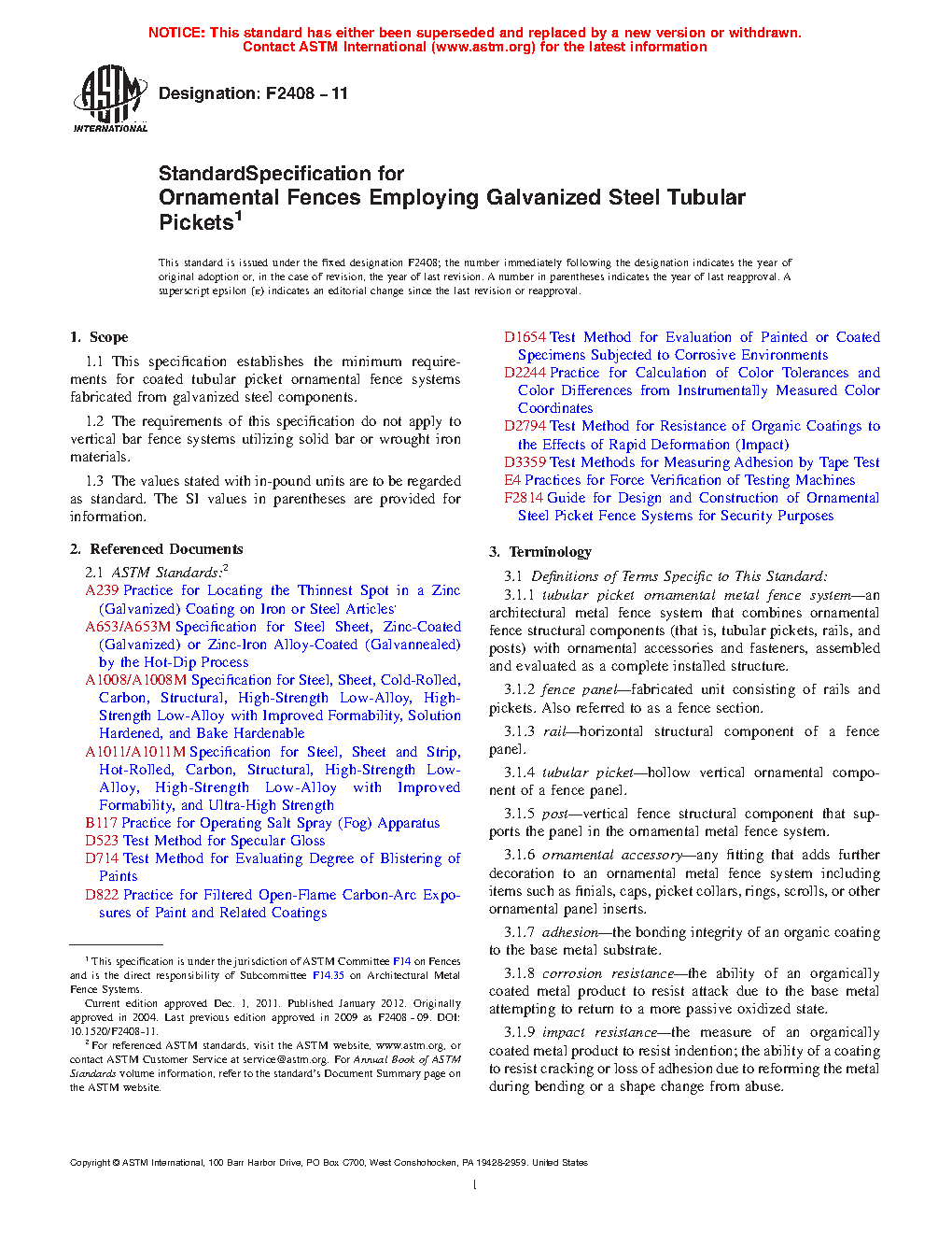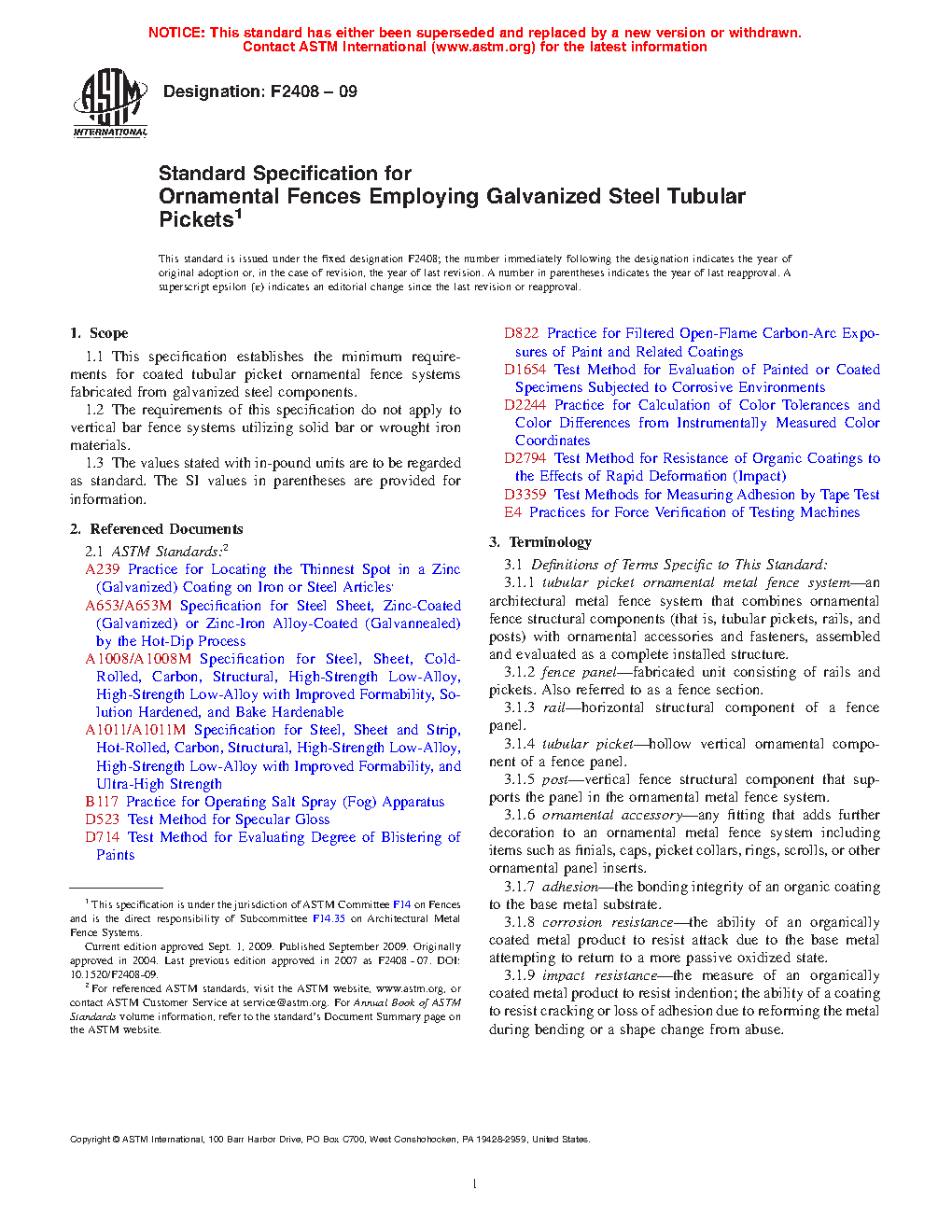 1.1 This specification establishes the minimum requirements for coated tubular picket ornamental fence systems fabricated from galvanized steel components.