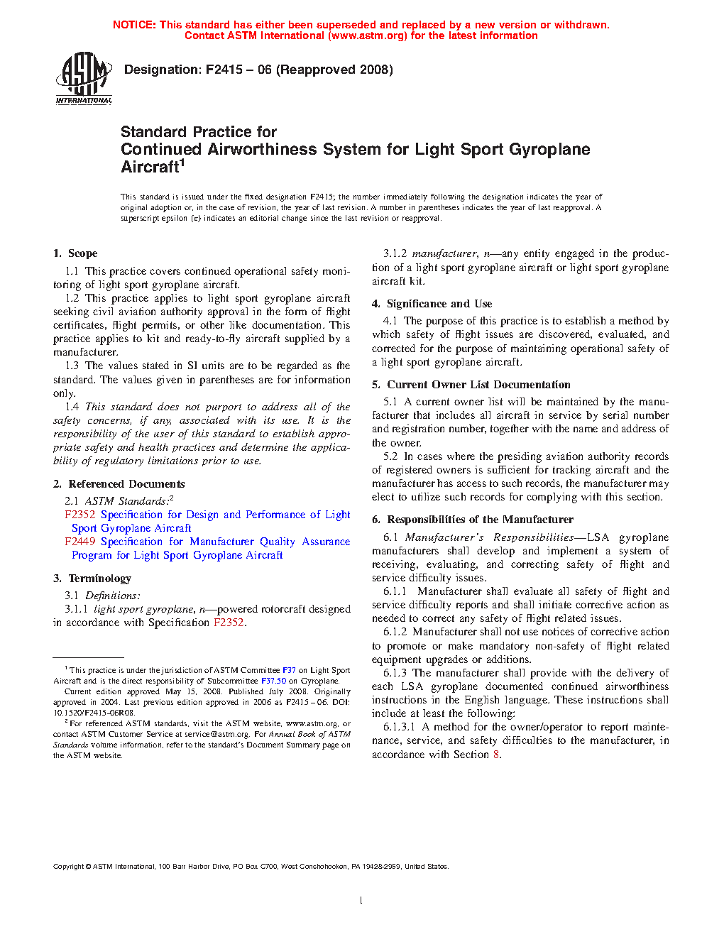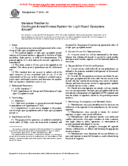 1.1 This practice covers continued operational safety monitoring of light sport gyroplane aircraft.