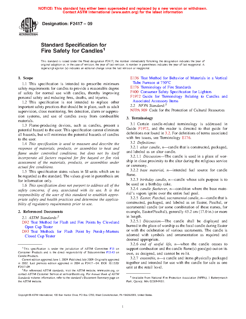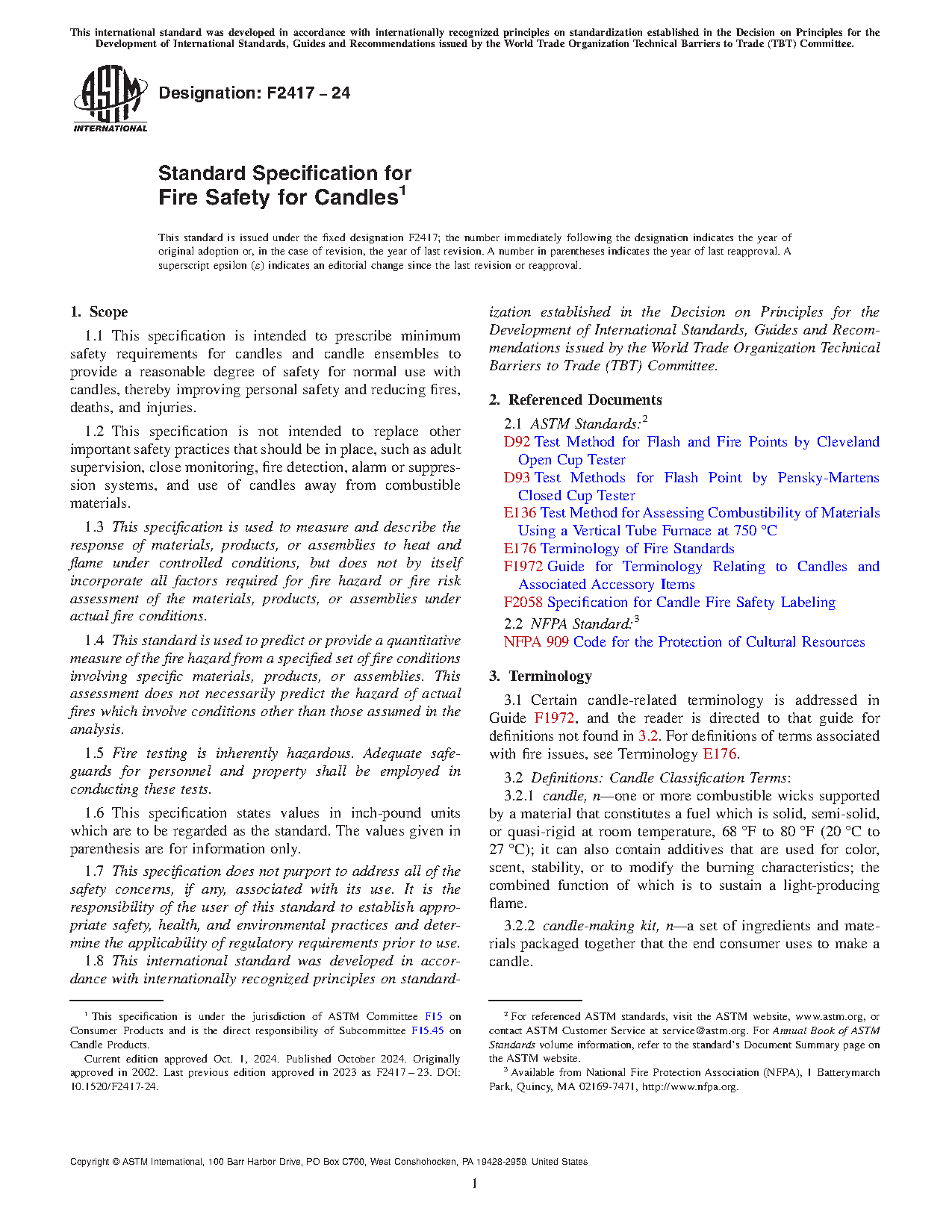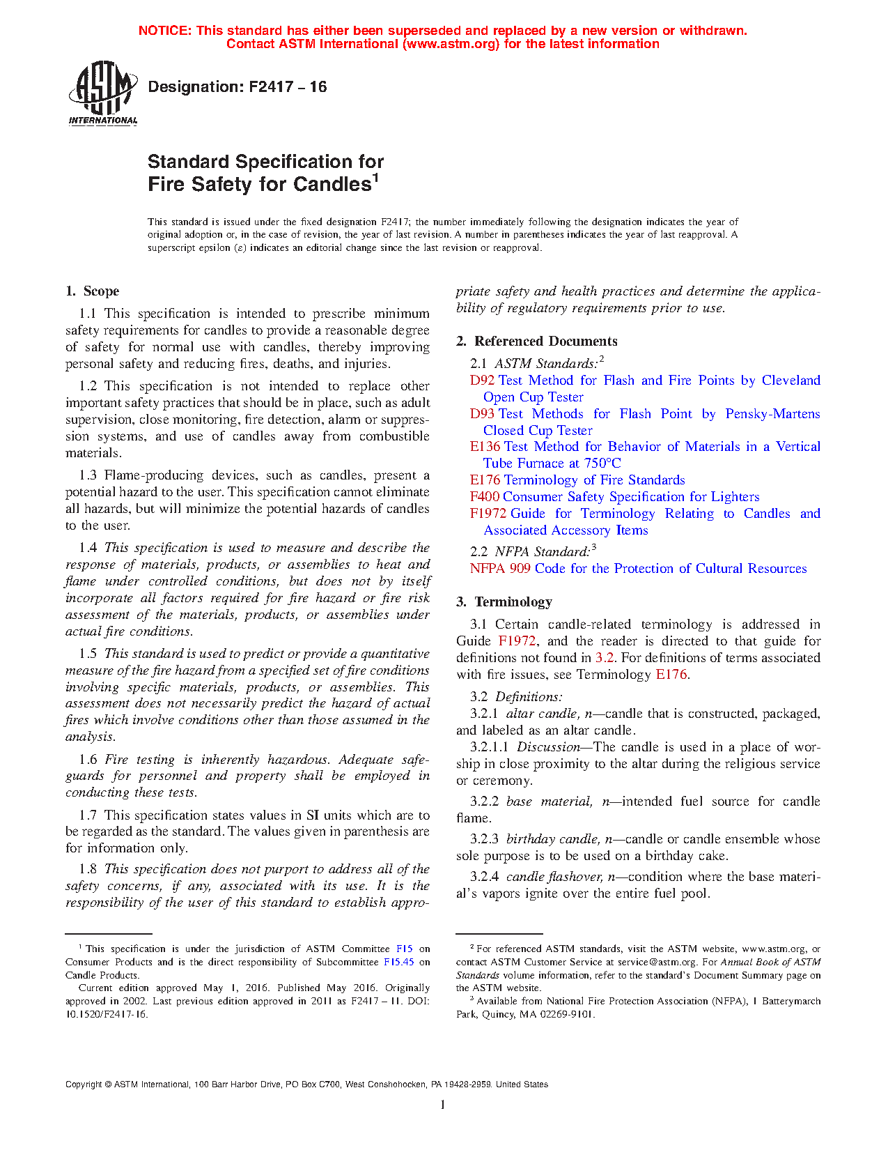 1.1 This specification is intended to prescribe minimum safety requirements for candles and candle ensembles to provide a reasonable degree of safety for normal use with candles, thereby improving personal safety and reducing fires, deaths, and injuries.