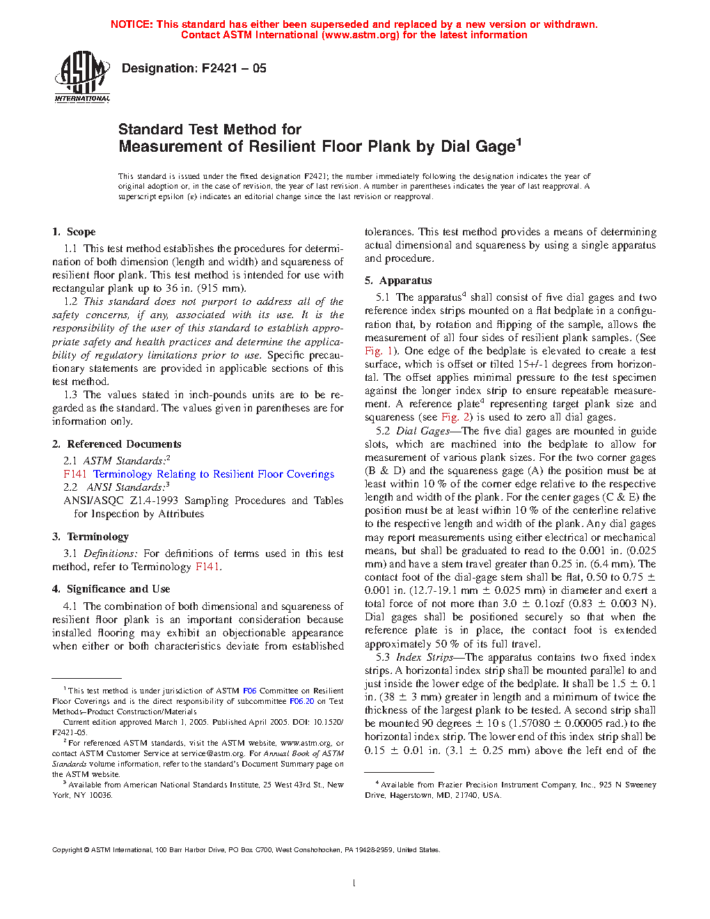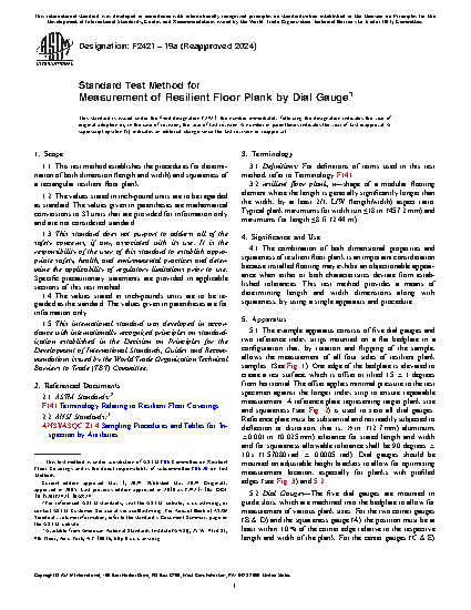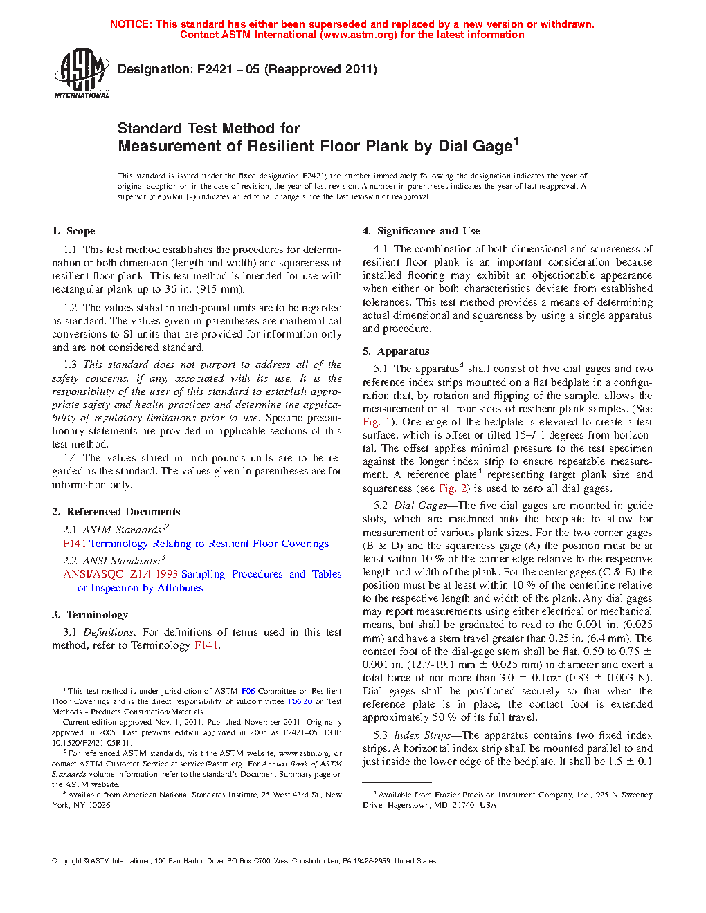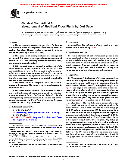 1.1 This test method establishes the procedures for determination of both dimension (length and width) and squareness of a rectangular resilient floor plank.
