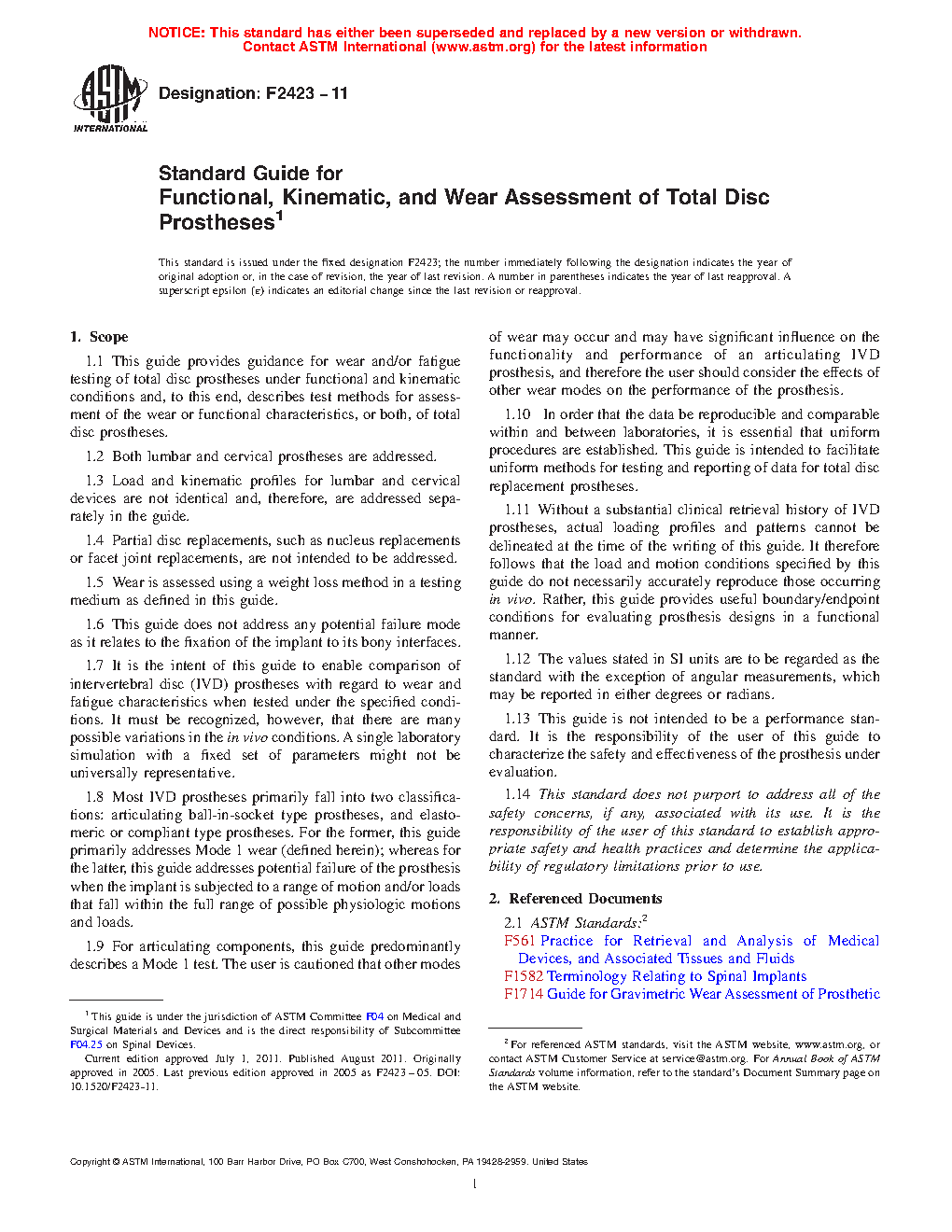 1.1 This guide provides guidance for wear and/or fatigue testing of total disc prostheses under functional and kinematic conditions and, to this end, describes test methods for assessment of the wear or functional characteristics, or both, of total disc prostheses.