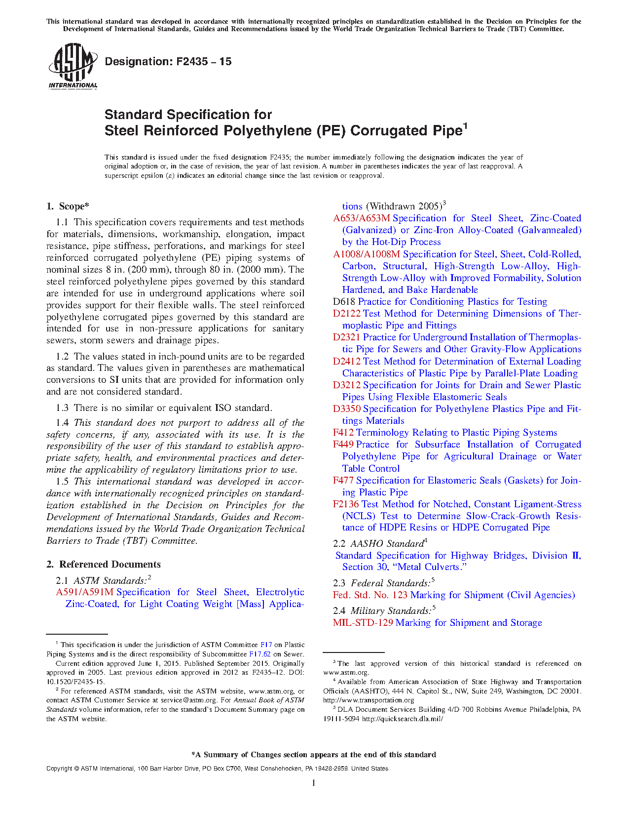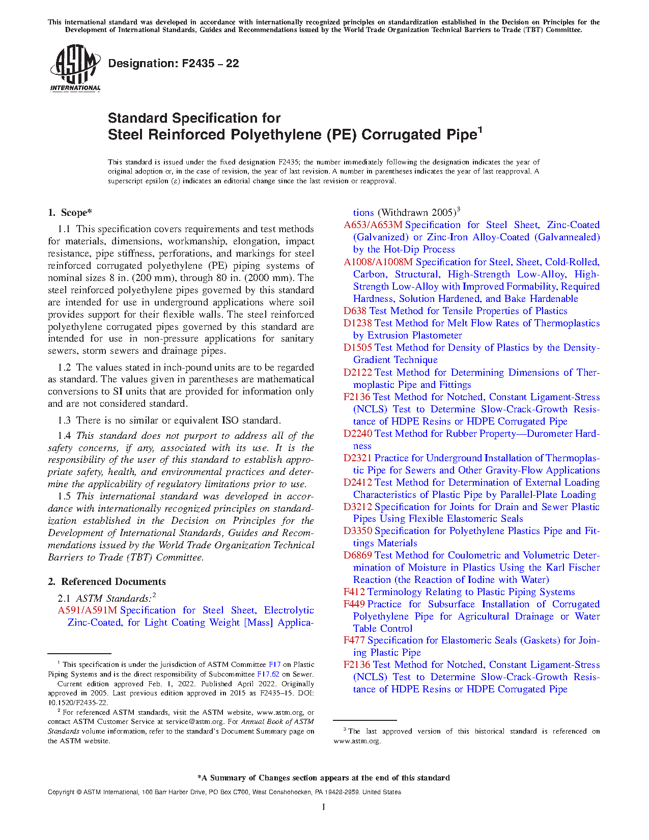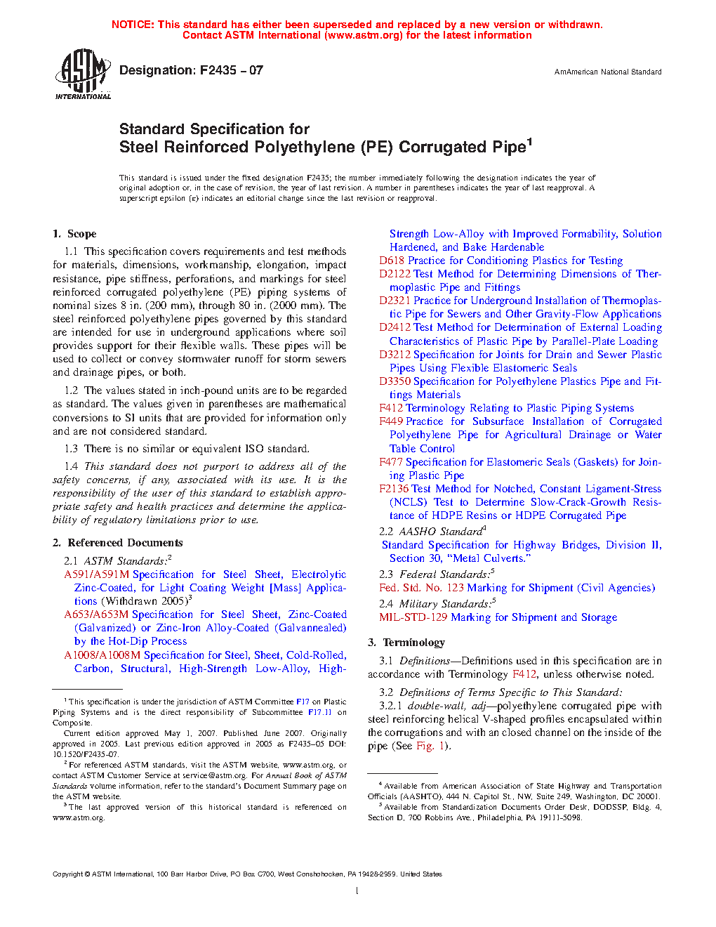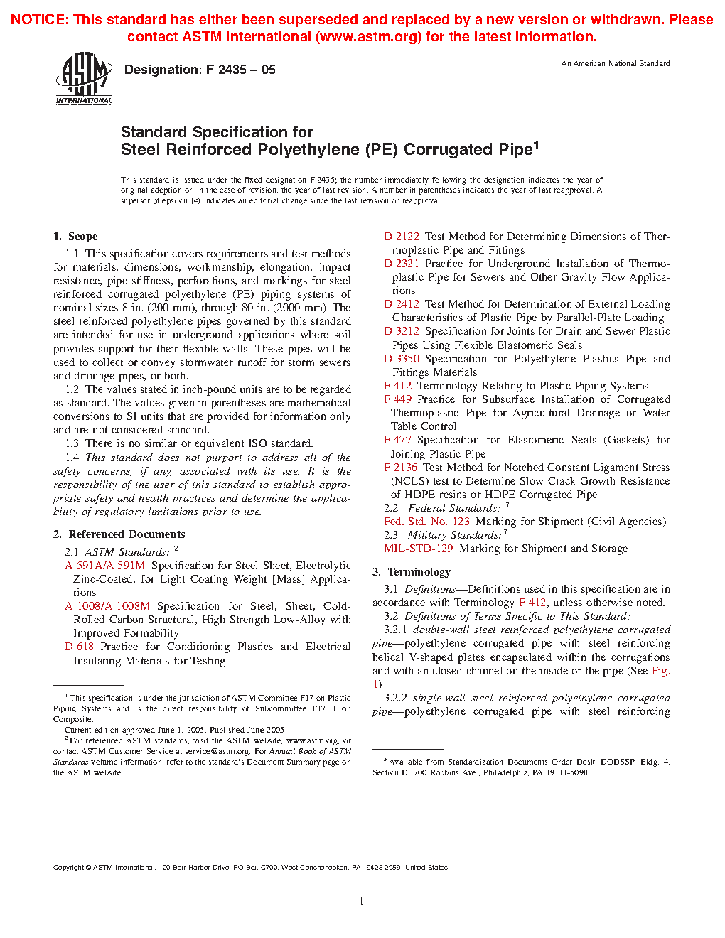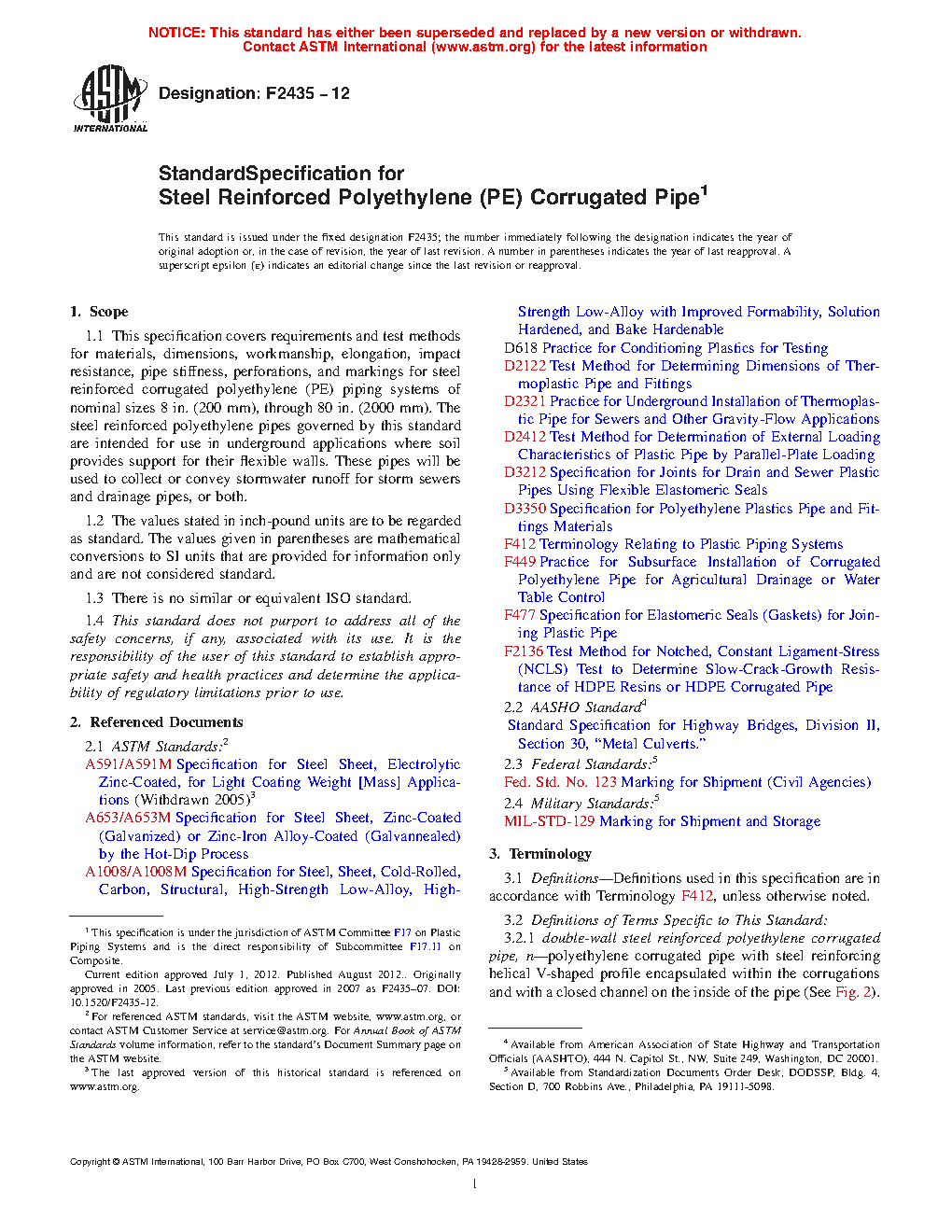 1.1 This specification covers requirements and test methods for materials, dimensions, workmanship, elongation, impact resistance, pipe stiffness, perforations, and markings for steel reinforced corrugated polyethylene (PE) piping systems of nominal sizes 8 in. (200 mm), through 80 in. (2000 mm). The steel reinforced polyethylene pipes governed by this standard are intended for use in underground applications where soil provides support for their flexible walls. The steel reinforced polyethylene corrugated pipes governed by this standard are intended for use in non-pressure applications for sanitary sewers, storm sewers and drainage pipes.
