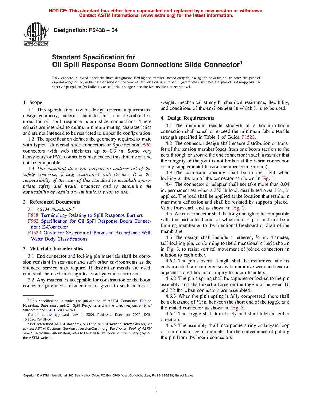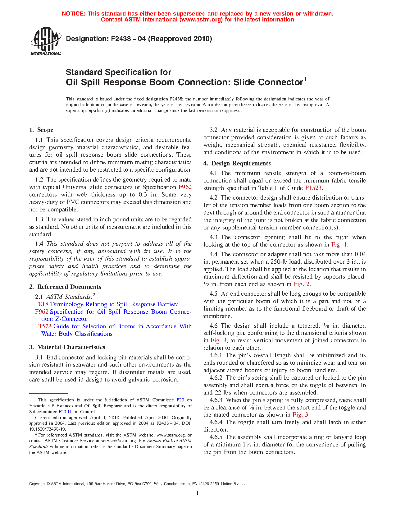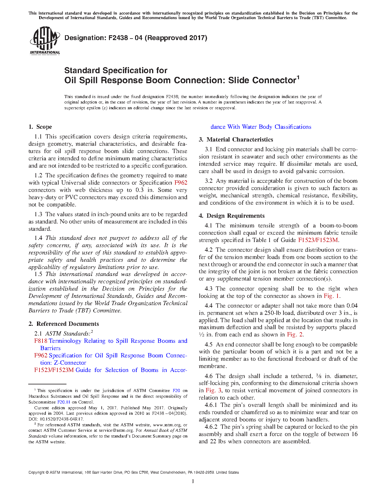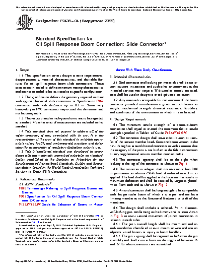 1.1 This specification covers design criteria requirements, design geometry, material characteristics, and desirable features for oil spill response boom slide connections. These criteria are intended to define minimum mating characteristics and are not intended to be restricted to a specific configuration.