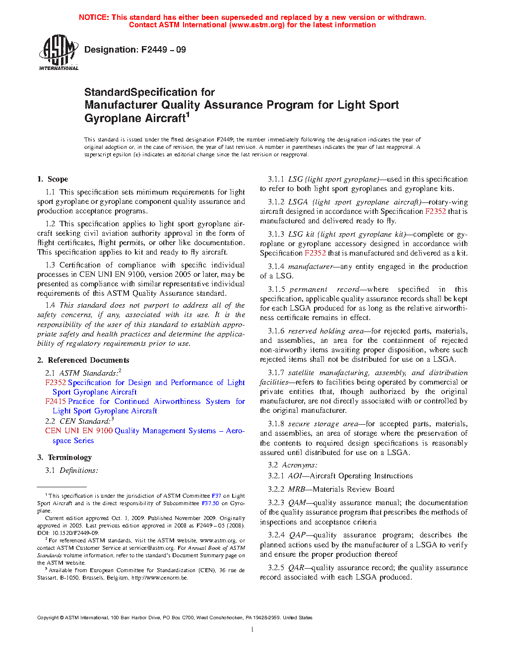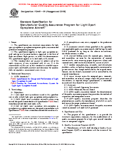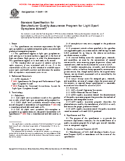 1.1 This specification sets minimum requirements for light sport gyroplane or gyroplane component quality assurance and production acceptance programs.