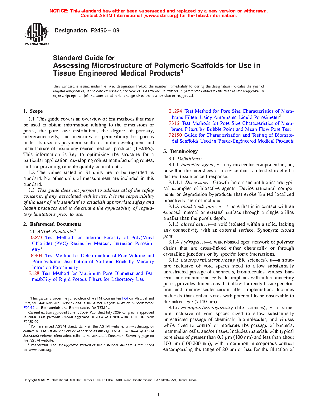 1.1 This guide covers an overview of test methods that may be used to obtain information relating to the dimensions of pores, the pore size distribution, the degree of porosity, interconnectivity, and measures of permeability for porous materials used as polymeric scaffolds in the development and manufacture of tissue-engineered medical products (TEMPs). This information is key to optimizing the structure for a particular application, developing robust manufacturing routes, and providing reliable quality control data.