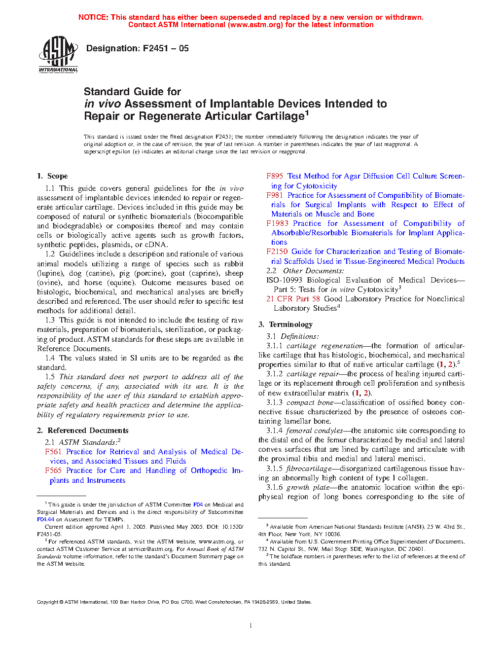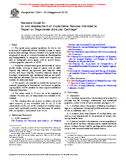 1.1 This guide covers general guidelines for the in vivo assessment of implantable devices intended to repair or regenerate articular cartilage. Devices included in this guide may be composed of natural or synthetic biomaterials (biocompatible and biodegradable) or composites thereof and may contain cells or biologically active agents such as growth factors, synthetic peptides, plasmids, or cDNA.