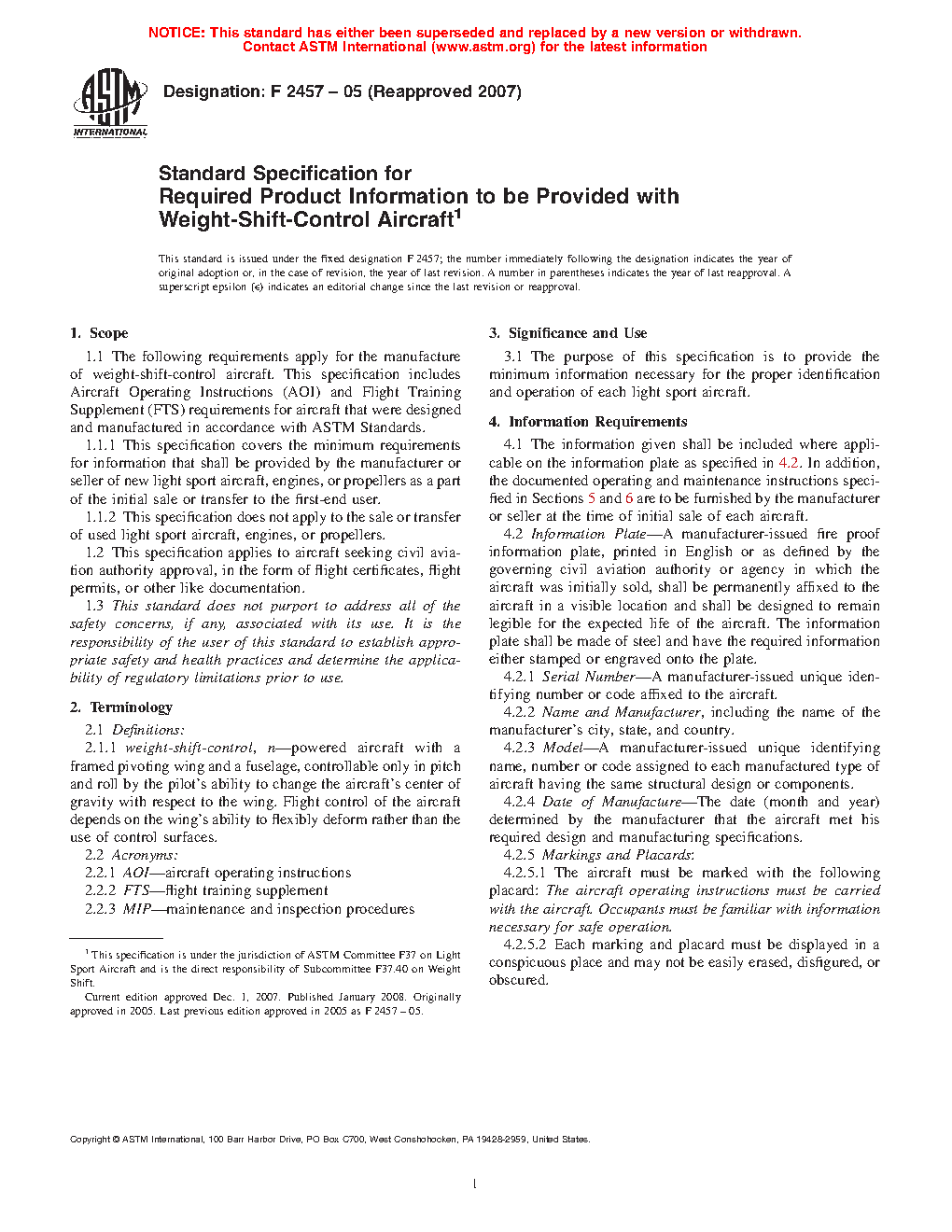 1.1 The following requirements apply for the manufacture of weight-shift-control aircraft. This specification includes Aircraft Operating Instructions (AOI) and Flight Training Supplement (FTS) requirements for aircraft that were designed and manufactured in accordance with ASTM Standards.
