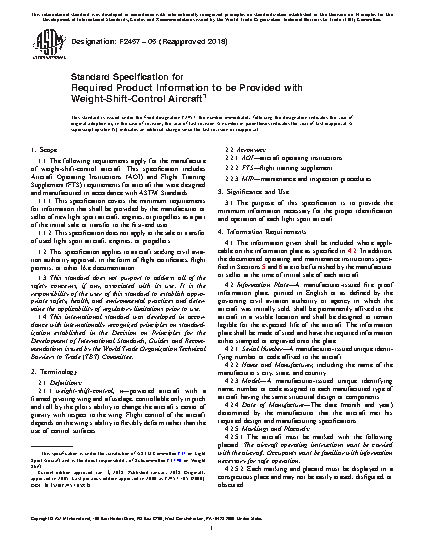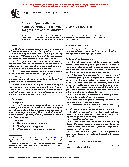 1.1 The following requirements apply for the manufacture of weight-shift-control aircraft. This specification includes Aircraft Operating Instructions (AOI) and Flight Training Supplement (FTS) requirements for aircraft that were designed and manufactured in accordance with ASTM Standards.