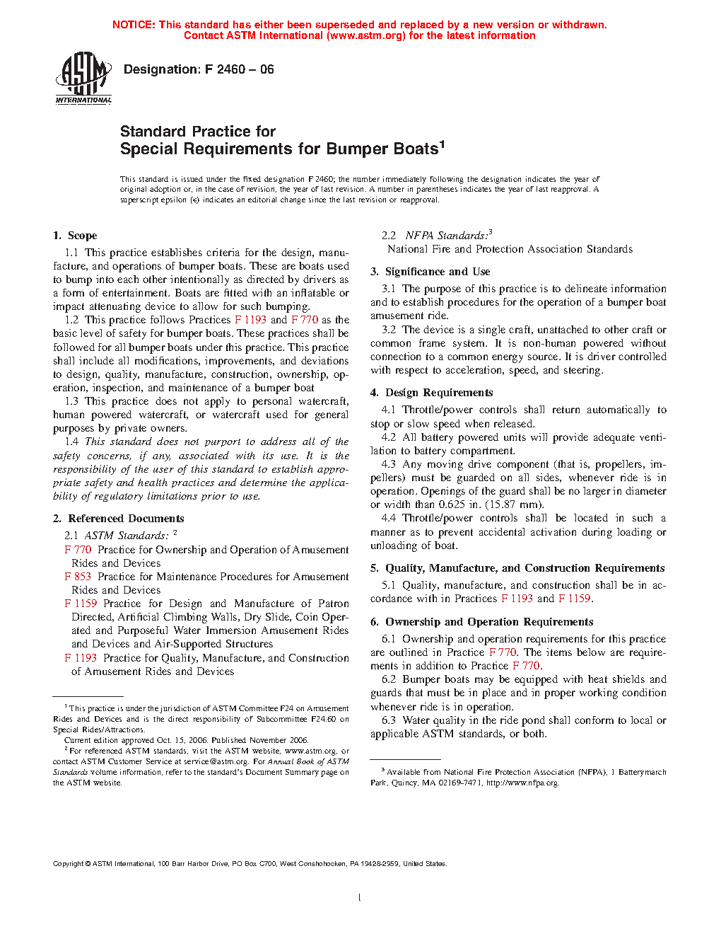 1.2 This practice follows Practices F 1193 and F 770 as the basic level of safety for bumper boats. These practices shall be followed for all bumper boats under this practice. This practice shall include all modifications, improvements, and deviations to design, quality, manufacture, construction, ownership, operation, inspection, and maintenance of a bumper boat