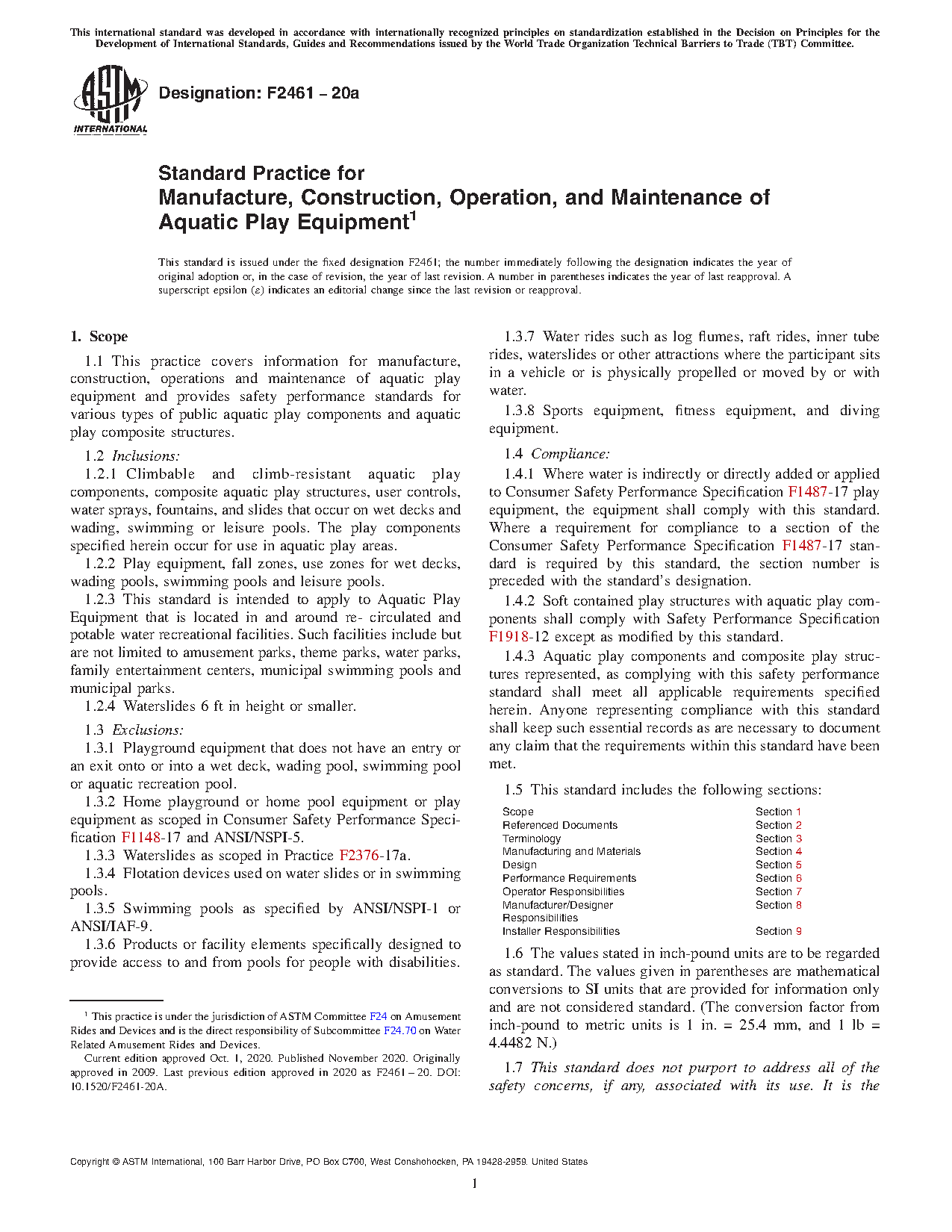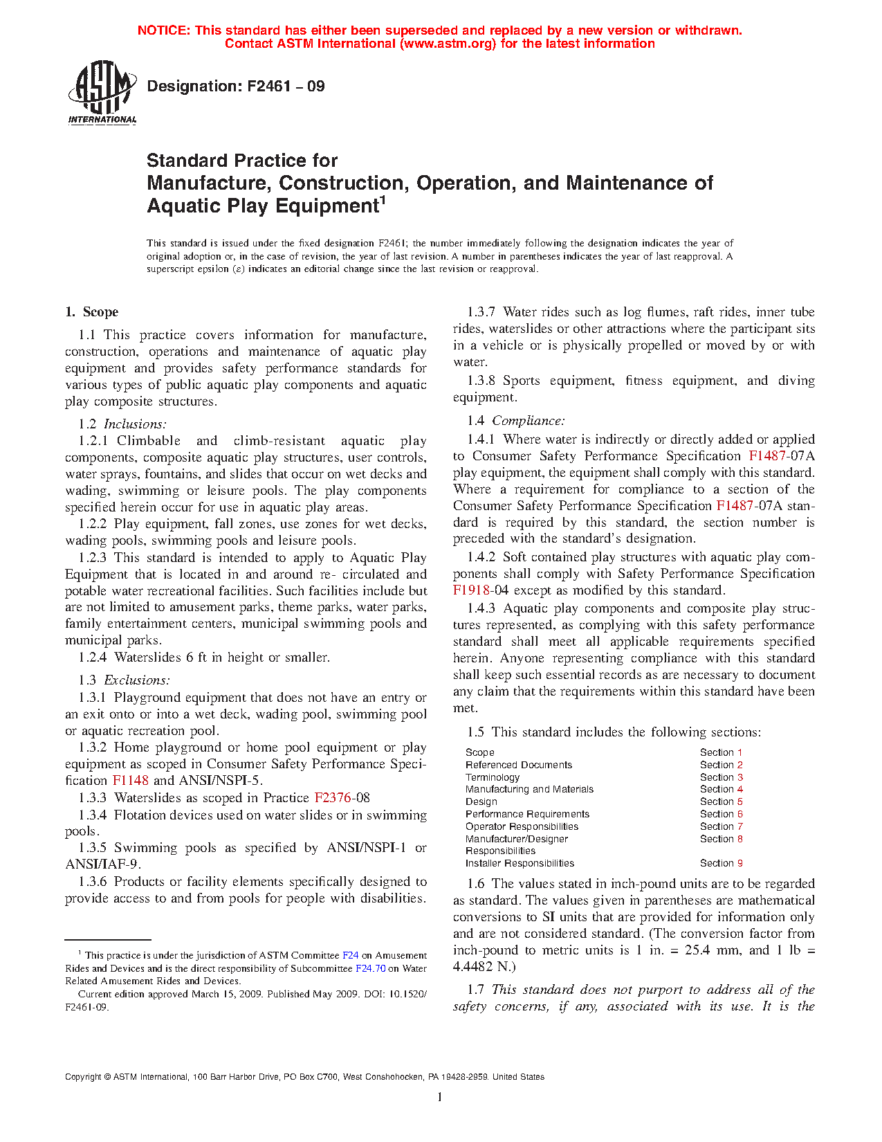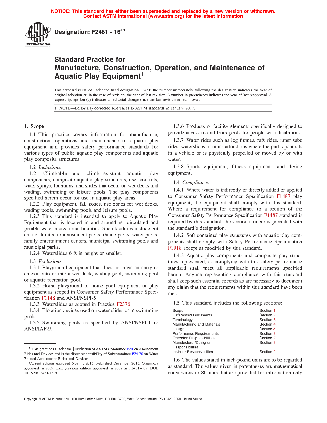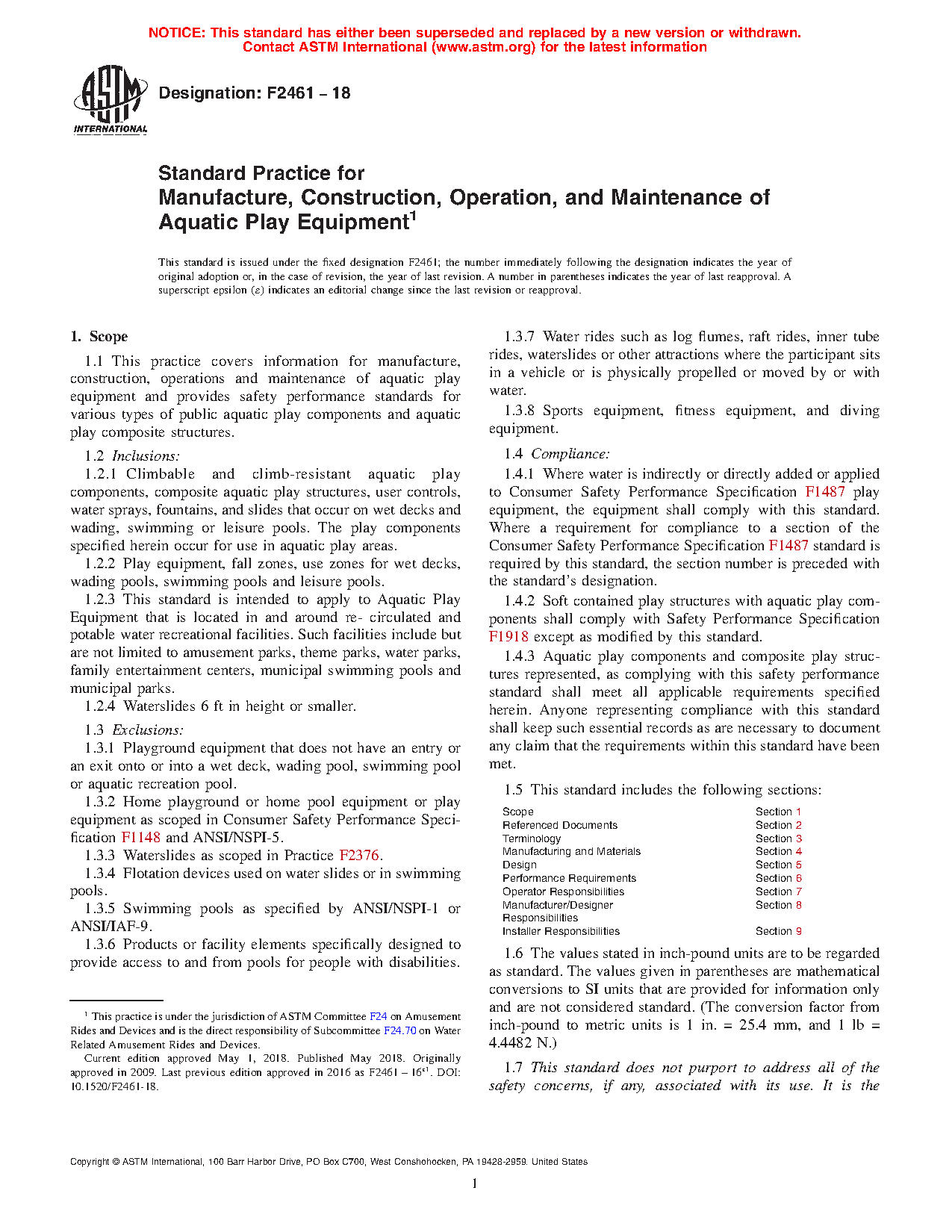 1.4.1 Where water is indirectly or directly added or applied to Consumer Safety Performance Specification F1487-21 play equipment, the equipment shall comply with this standard. Where a requirement for compliance to a section of the Consumer Safety Performance Specification F1487-21 standard is required by this standard, the section number is preceded with the standard's designation.