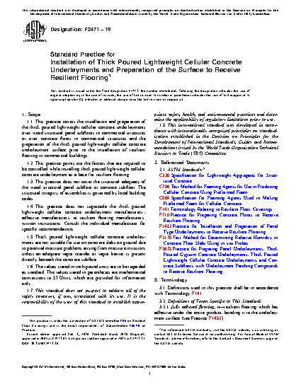1.1 This practice covers the installation and preparation of the thick poured lightweight cellular concrete underlayments over wood structural panel subfloors in commercial structures or over concrete floors in commercial structures and the preparation of the thick poured lightweight cellular concrete underlayment surface prior to the installation of resilient flooring in commercial buildings.