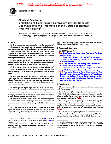 1.2 This practice points out the factors that are required to be controlled while installing thick poured lightweight cellular concrete underlayment as a base for resilient flooring.