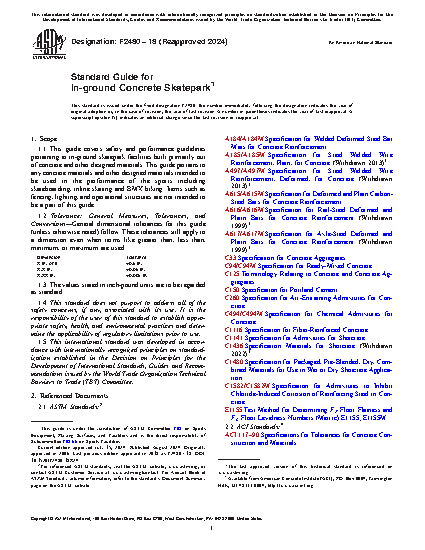 1.1 This guide covers safety and performance guidelines pertaining to in-ground skatepark facilities built primarily out of concrete and other designed materials. This guide pertains to any concrete materials and other designed materials intended to be used in the performance of the sports including skateboarding, inline skating and BMX biking. Items such as fencing, lighting, and operational structures are not intended to be a part of this guide.