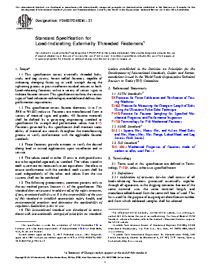 1.1 This specification covers externally threaded bolts, studs, and cap screws, herein called fasteners, capable of indicating clamping forces up to yield strength during the tightening process or post installation residual tension, or both. Load-indicating fasteners utilize a variety of sensor types to indicate fastener tension. This specification outlines the various types of load indication technologies available and defines their performance requirements.