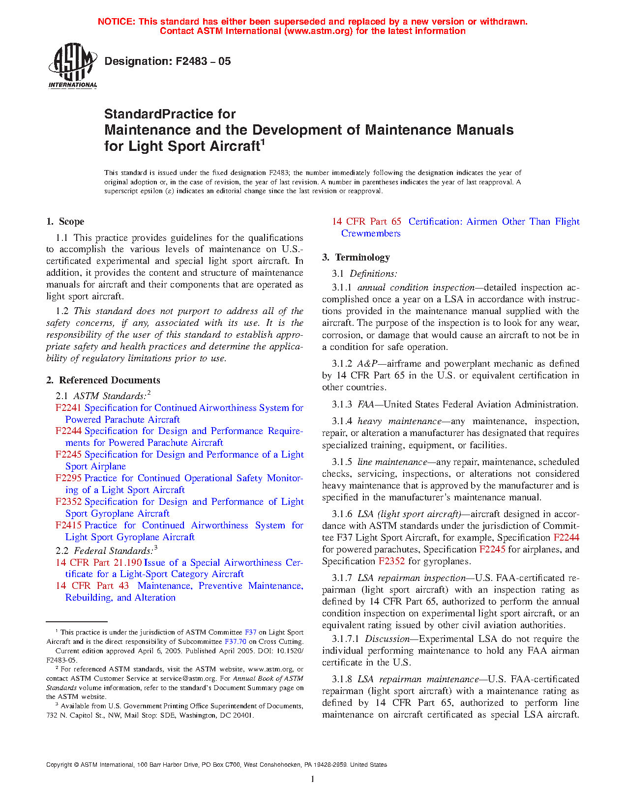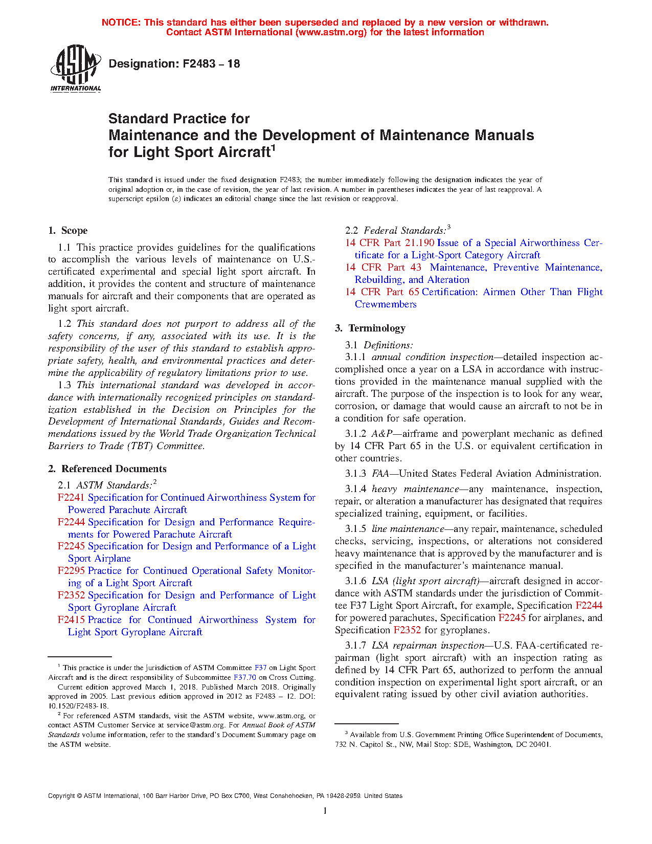 1.1 This practice provides guidelines for the qualifications to accomplish the various levels of maintenance on U.S.-certificated experimental and special light sport aircraft. In addition, it provides the content and structure of maintenance manuals for aircraft and their components that are operated as light sport aircraft.