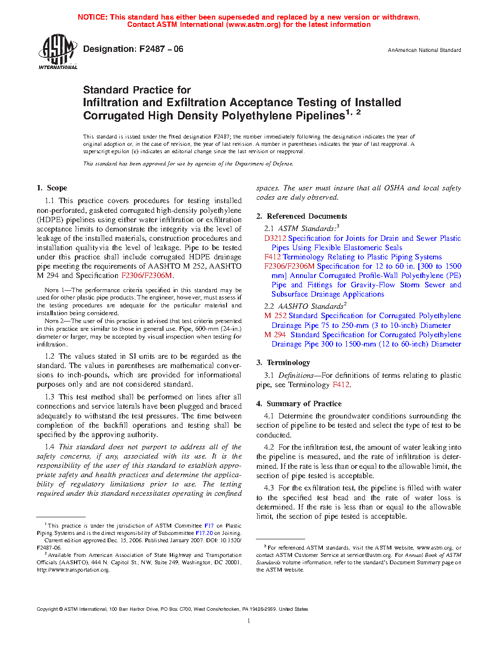 1.1 This practice covers procedures for testing installed non-perforated, gasketed corrugated high-density polyethylene (HDPE) and corrugated polypropylene (PP) pipelines using either water infiltration or exfiltration acceptance limits to demonstrate the integrity via the level of leakage of the installed materials, construction procedures and installation qualityvia the level of leakage. Pipe to be tested under this practice shall include corrugated HDPE and PP drainage pipe meeting the requirements of AASHTO M 252, AASHTO M 294 and Specifications F2306/F2306M, F2736, F2762, F2763, F2764, and F2947.