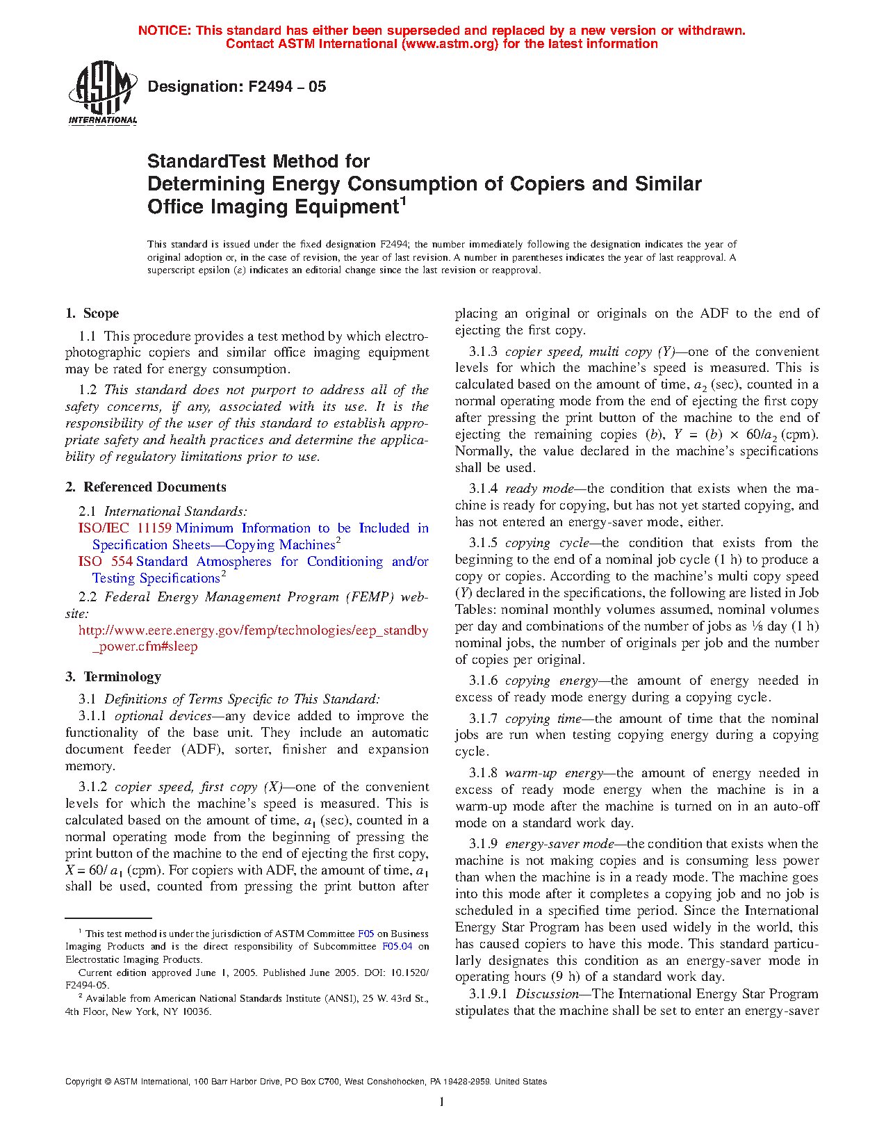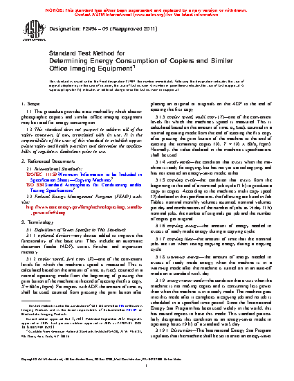 1.1 This procedure provides a test method by which electro-photographic copiers and similar office imaging equipment may be rated for energy consumption.