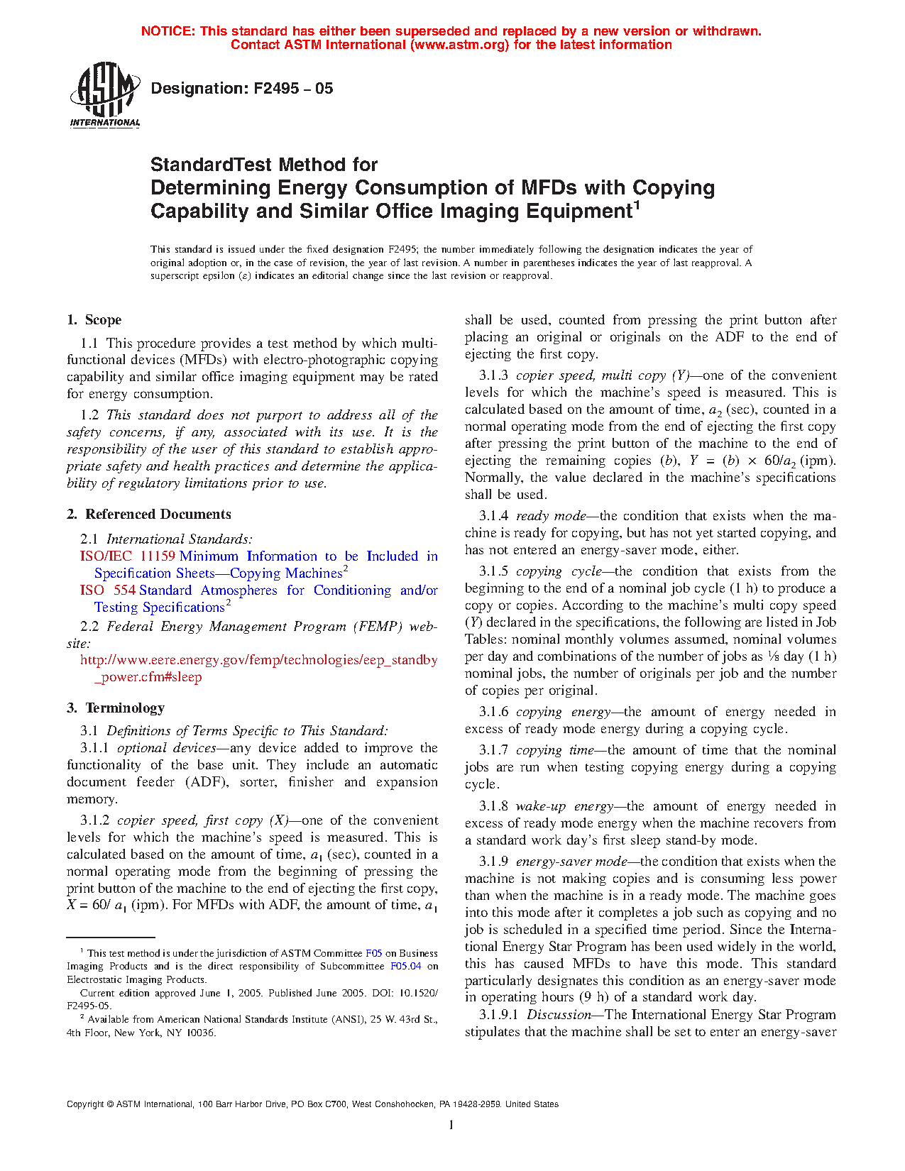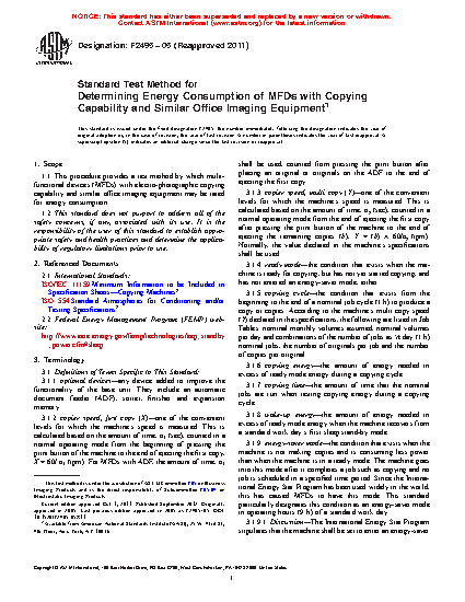 1.1 This procedure provides a test method by which multifunctional devices (MFDs) with electro-photographic copying capability and similar office imaging equipment may be rated for energy consumption.
