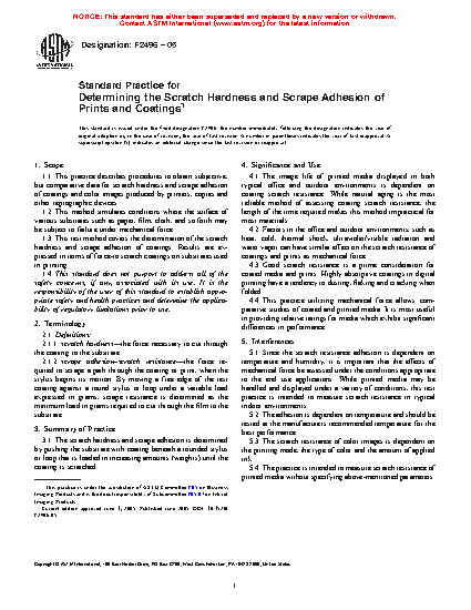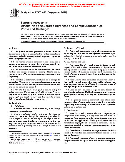1.1 This practice describes procedures to obtain subjective, but comparative data for scratch hardness and scrape adhesion of coatings and color images produced by printers, copies and other reprographic devices.