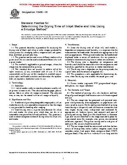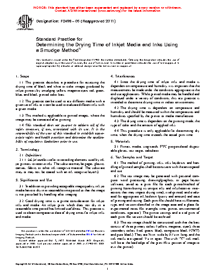 1.1 This practice describes a procedure for assessing the drying time of black and white or color images produced by inkjet printers by smudging yellow, magenta cyan, red, green, blue, and black printed color bars.