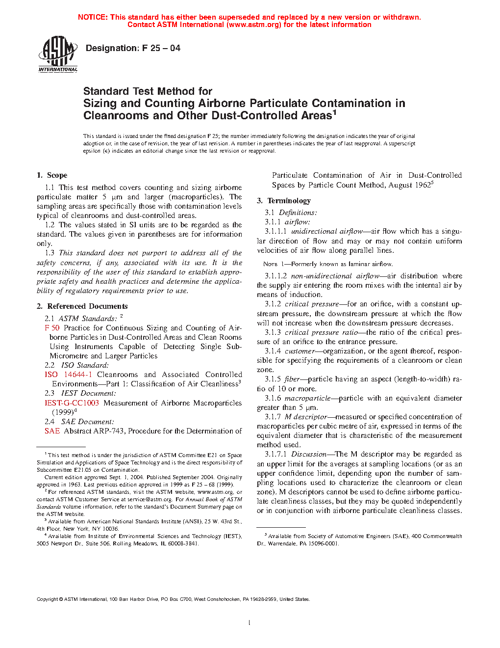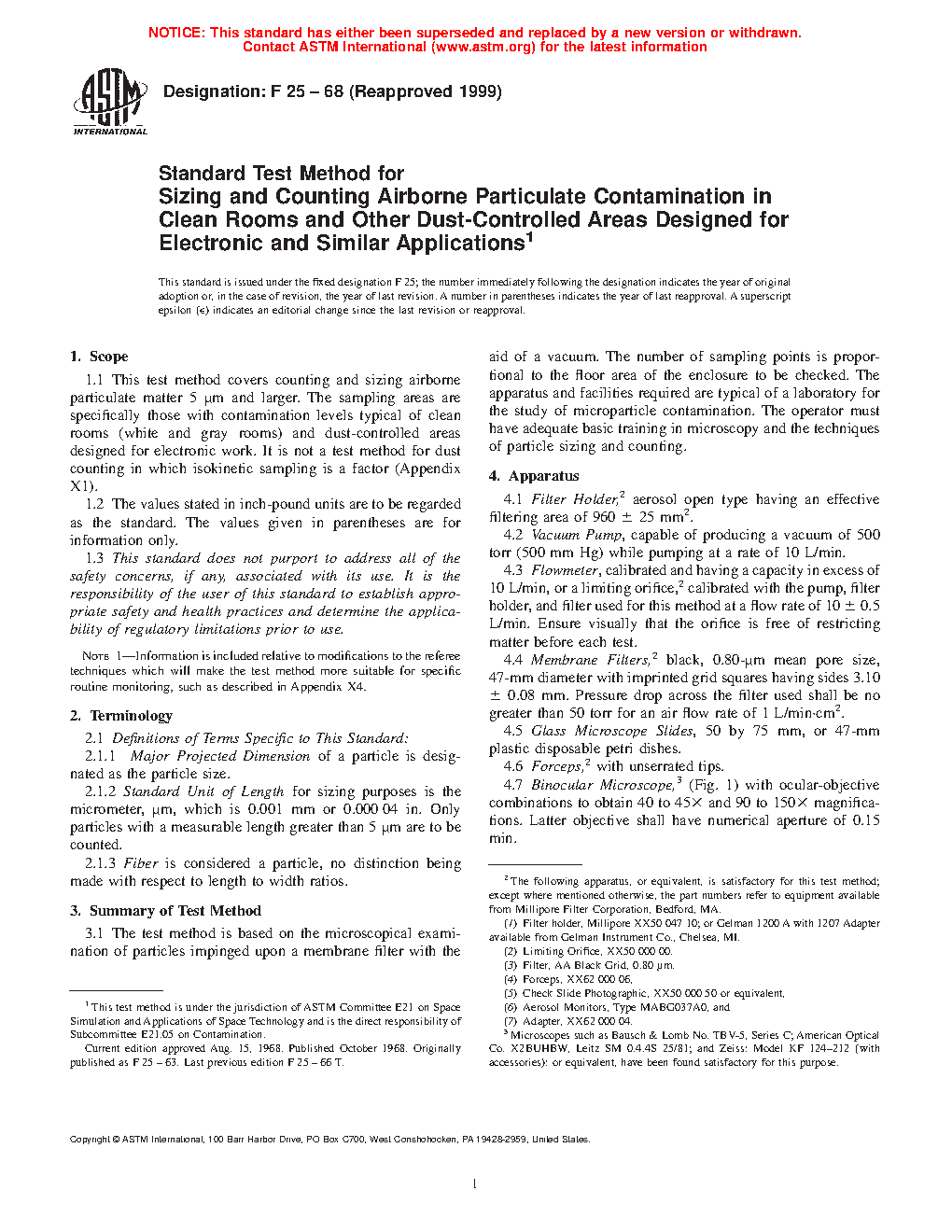 1.1 This test method covers counting and sizing airborne particulate matter 5 [mu]m and larger. The sampling areas are specifically those with contamination levels typical of clean rooms (white and gray rooms) and dust-controlled areas designed for electronic work. It is not a test method for dust counting where isokinetic sampling is a factor (Appendix X1).