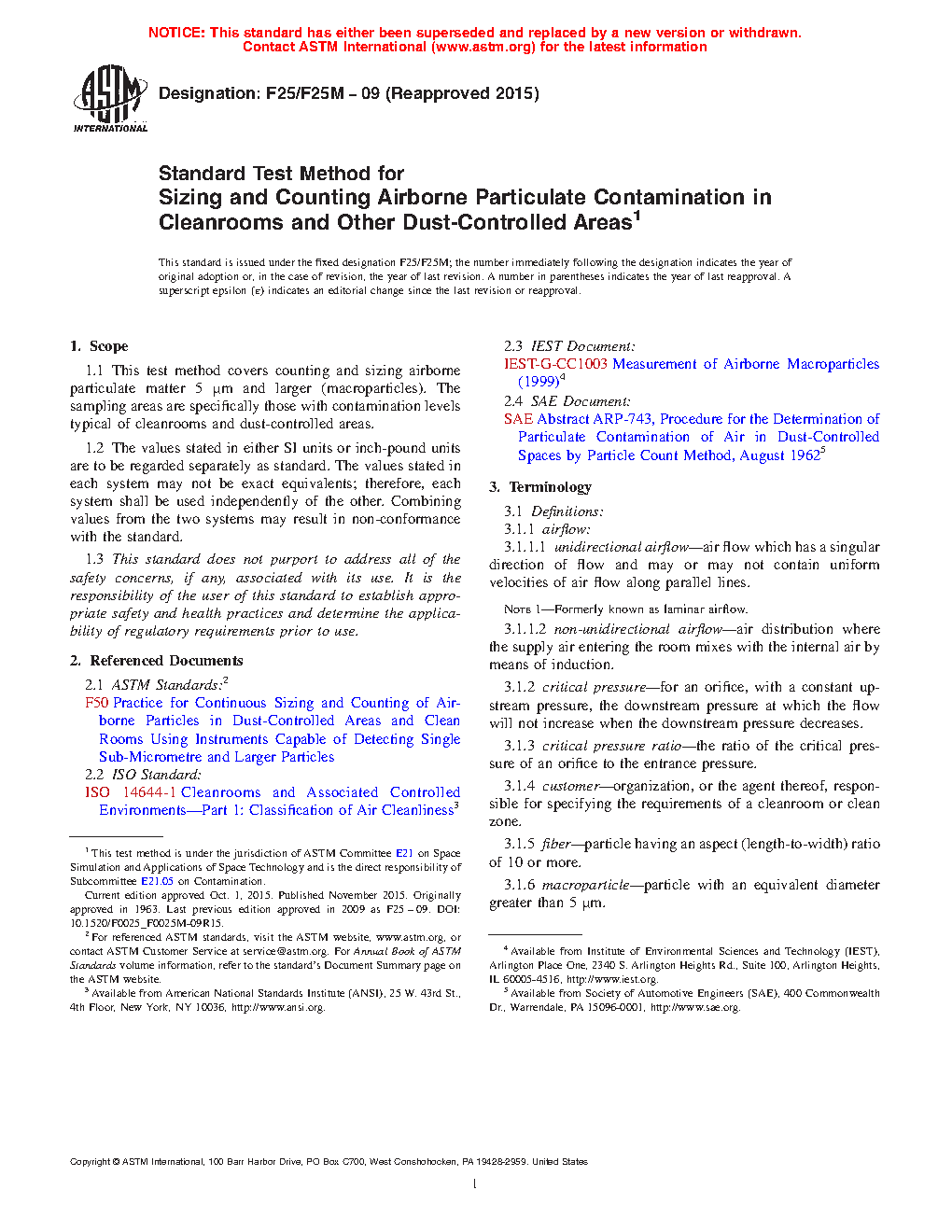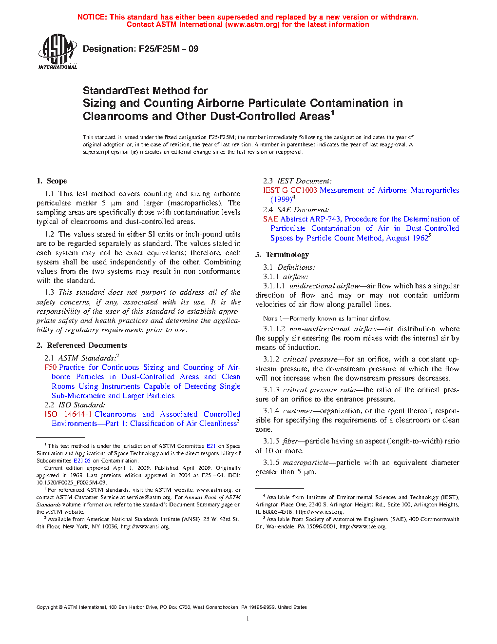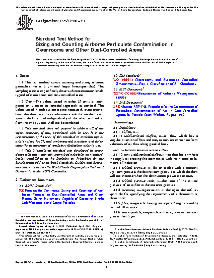 This test method covers the apparatuses required, sampling methods, standard procedures and calculations, and test reports for counting and sizing airborne microparticulate matter, the sampling areas for which are specifically those with contamination levels typical of cleanrooms and dust-controlled areas. The test method is based on the microscopical examination of particles impinged upon a membrane filter with the aid of a vacuum. Sampling may be done in a cleanroom, clean zone, or other controlle areas, or in a duct or pipe, wherein the number of sampling points is proportional to the floor area of the enclosure to be checked. The apparatus and facilities required are typical of a laboratory for the study of macroparticle contamination. The operator must have adequate basic training in microscopy and the techniques of particle sizing and counting.