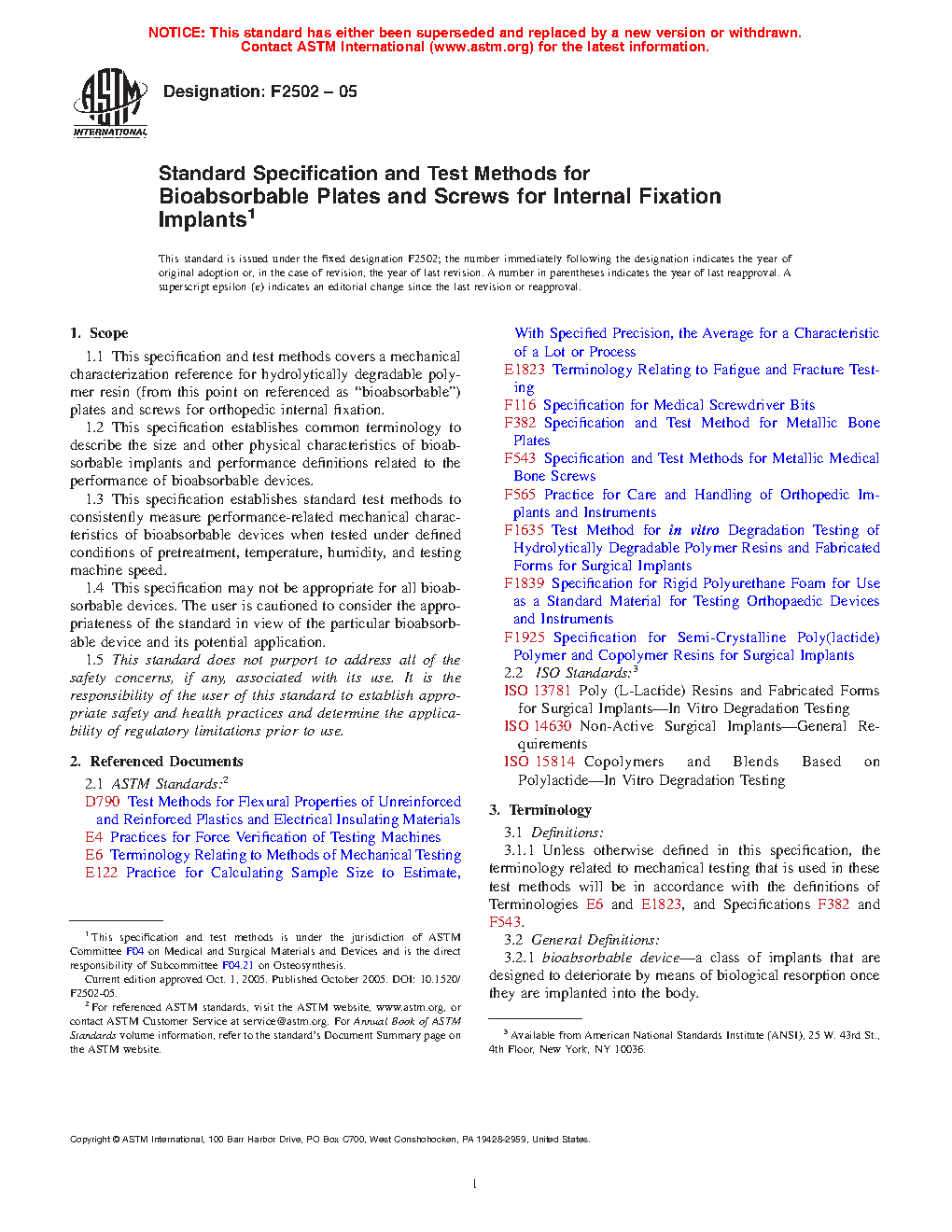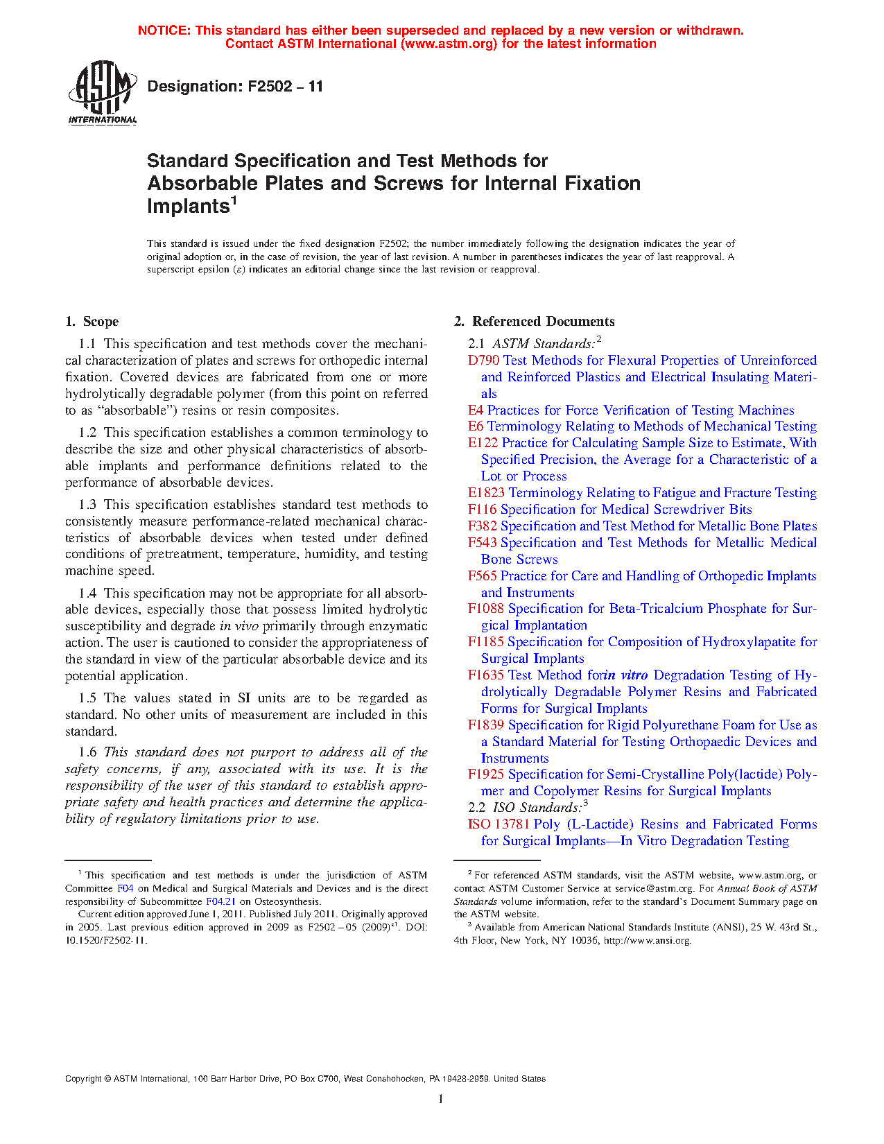 4.4 This specification and accompanying test methods are intended to complement the more general considerations for the assessment of absorbable polymeric implants that are described within Guide F2902.