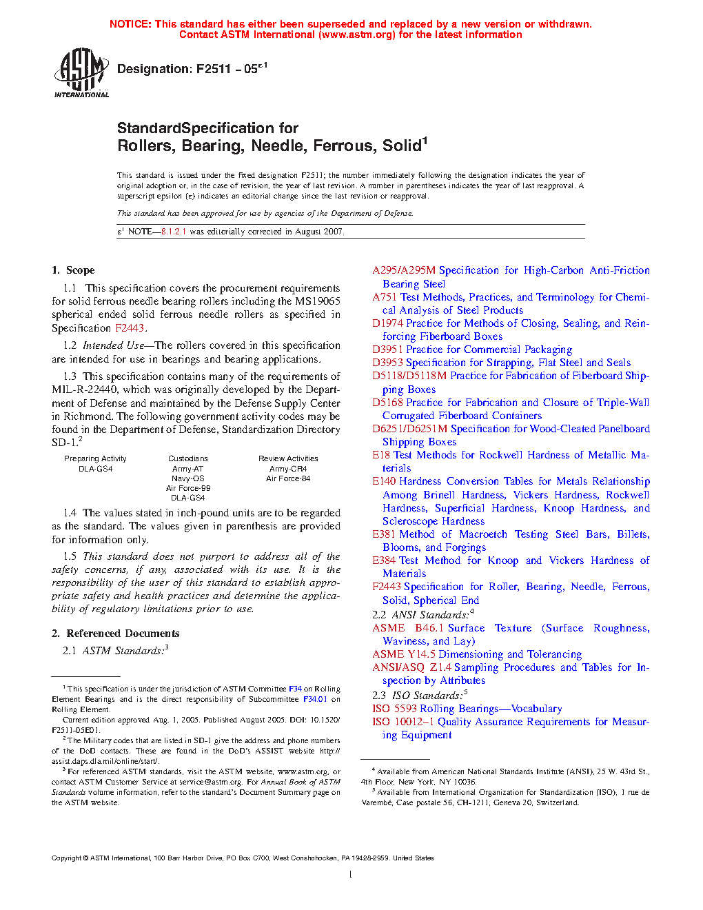 1.1 This specification covers the procurement requirements for solid ferrous needle bearing rollers including the MS19065 spherical ended solid ferrous needle rollers as specified in Specification F 2443.